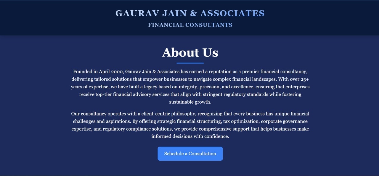Crafted a vibrant website for Gaurav Jain & Associates, a leading financial consultancy with over 25 years of guiding businesses to success. The site focuses on showcasing their expert financial services, connecting clients seamlessly, and attracting top talent. Its clean, mobile-friendly design welcomes visitors, featuring a Schedule a Consultation page for effortless client bookings, a Career Apply section to spark new opportunities, and social media links to share their story. It’s fast, secure, and search-friendly, amplifying their reach.
