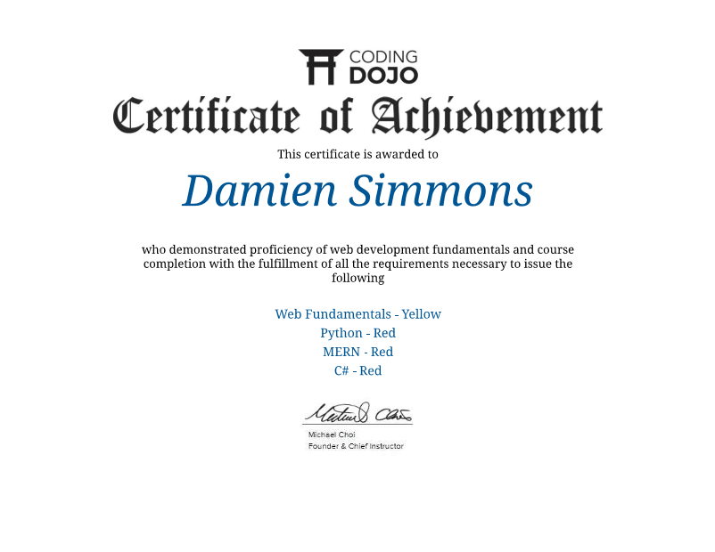 Coding Dojo's goal is to train students into a self-sufficient, versatile developer through a rigorous 3 Stack Curriculum. In 4 months, I learned 3 in-demand stacks in the industry and have a portfolio to show. More so through this experience, I learned efficient ways of absorbing and learning highly dense tech-industry workflows, frameworks, and libraries in small amounts of time.