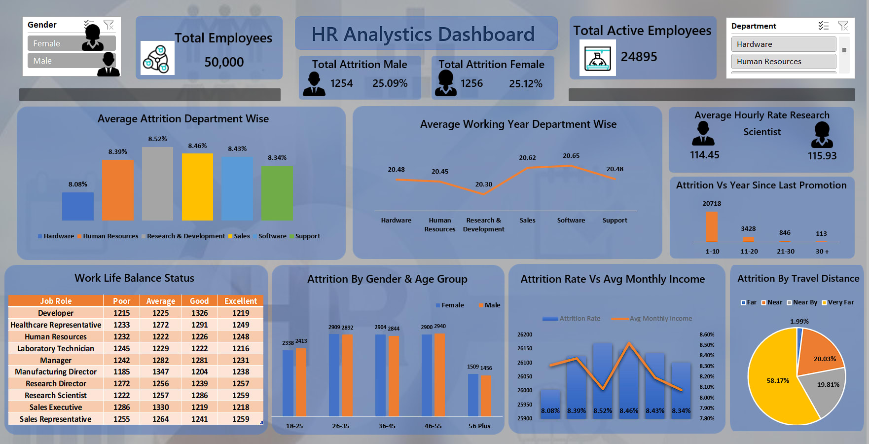 This project in the field of human resources examines how employees at various levels within an organization are leaving their jobs. The analysis of attrition rates takes into account several factors, including the employees' monthly earnings, the year of their last promotion, their job roles, and their work-life balance. This analysis is conducted for employees in various departments.