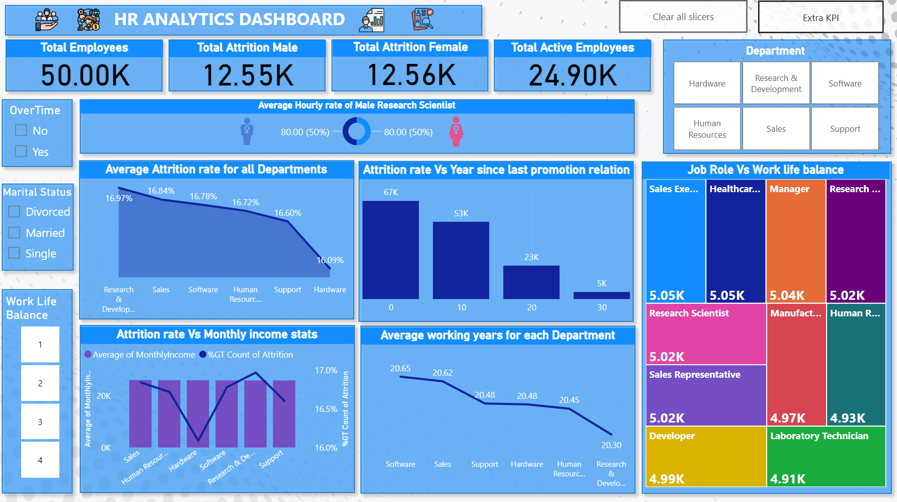 This project in the field of human resources examines how employees at various levels within an organization are leaving their jobs. The analysis of attrition rates takes into account several factors, including the employees' monthly earnings, the year of their last promotion, their job roles, and their work-life balance. This analysis is conducted for employees in various departments.