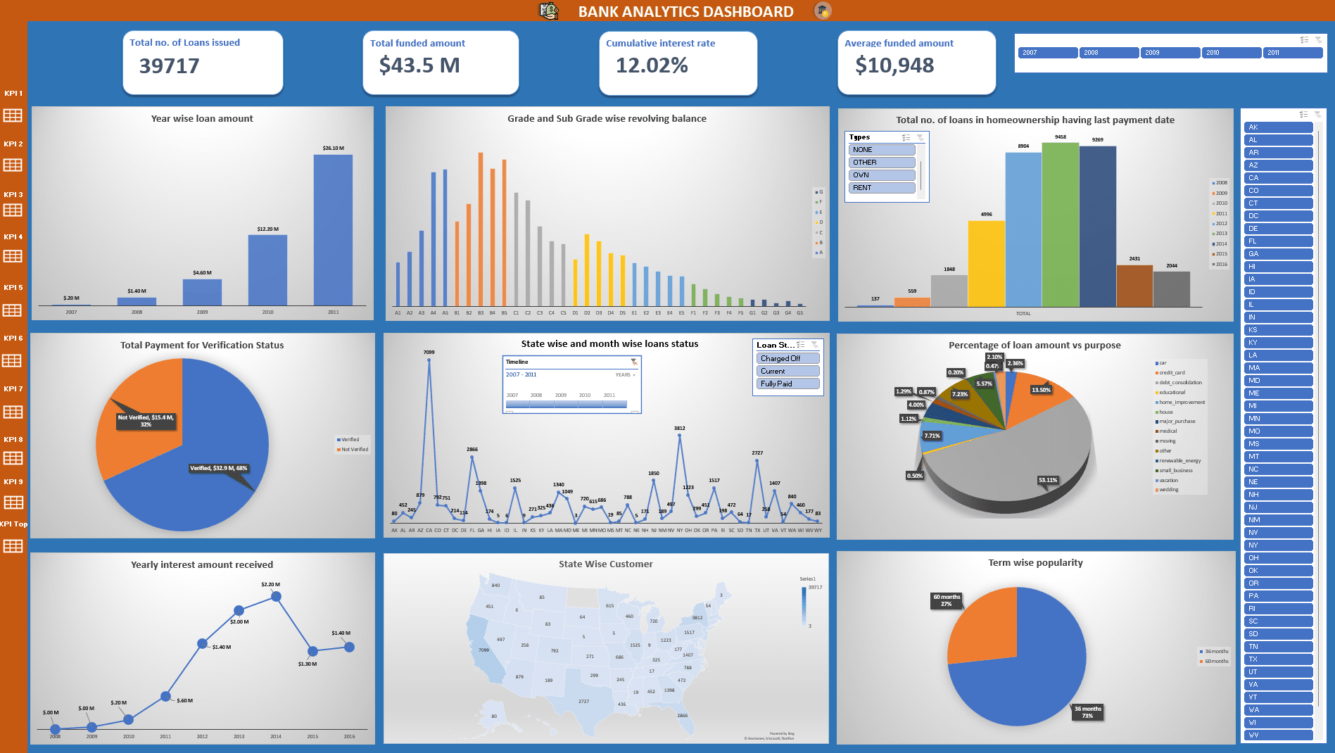 As part of an Excel R project, a real-life sample was showcased on the dashboard. The project involved analyzing loans provided by a financial institution to customers of diverse grades and sub-grade levels. The analysis encompassed factors such as loan disbursement reasons, funded amounts, revolving balance values, customer locations in various states and geolocations, as well as customer payment modes, and the latest payment values.