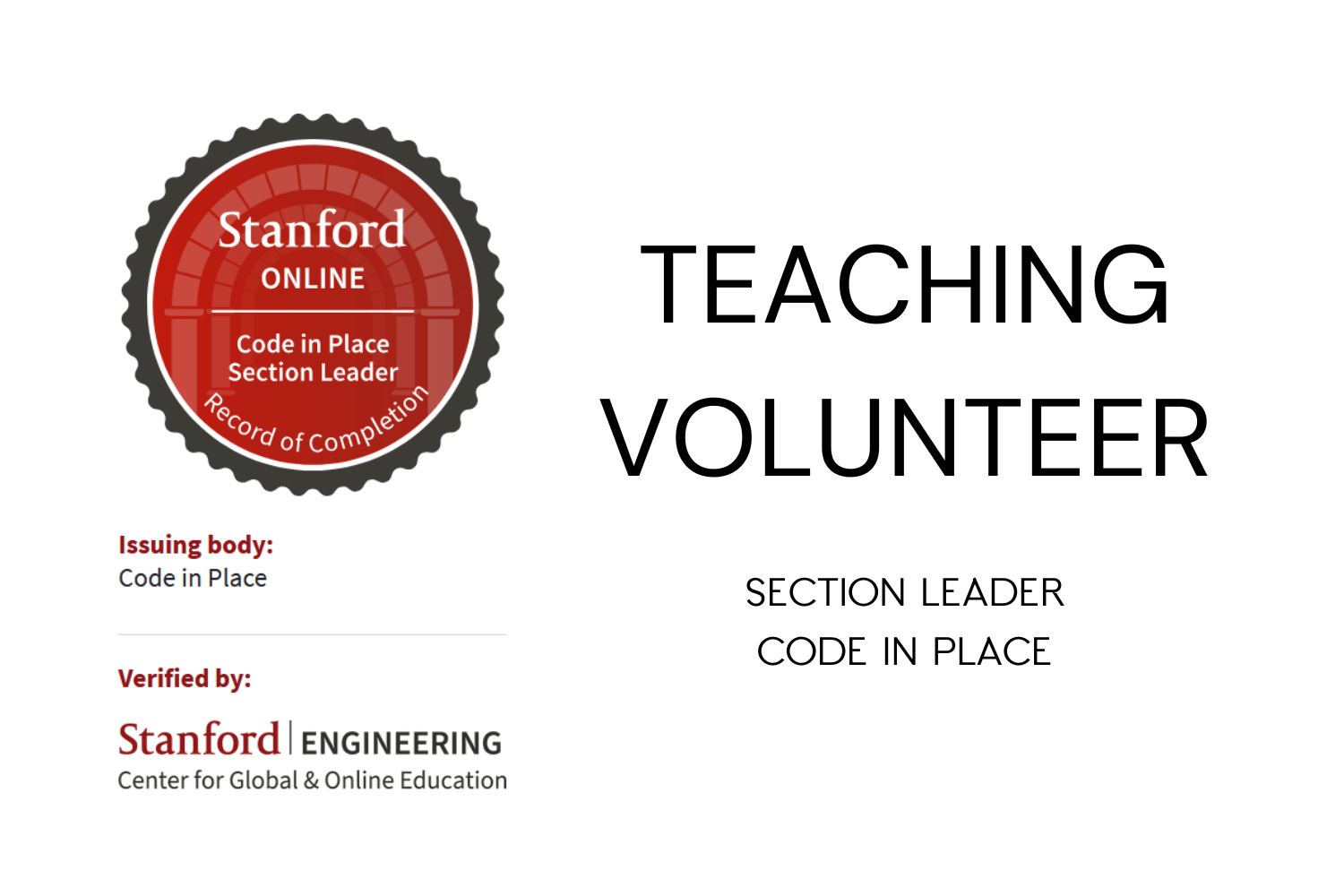 I've volunteered as a Section Leader (SL) for 3 consecutive years (2023 to 2025) during Apr-May. Code in Place is Stanford University's intro to coding course in Python. It is free and human-centered.