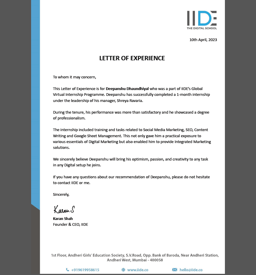 I got the opportunity to work with India's no. 1 Digital marketing training institute where I got practical exposure and performed real-time activities like SEO-optimised blog writing, Google Workspace, Social media marketing, etc.