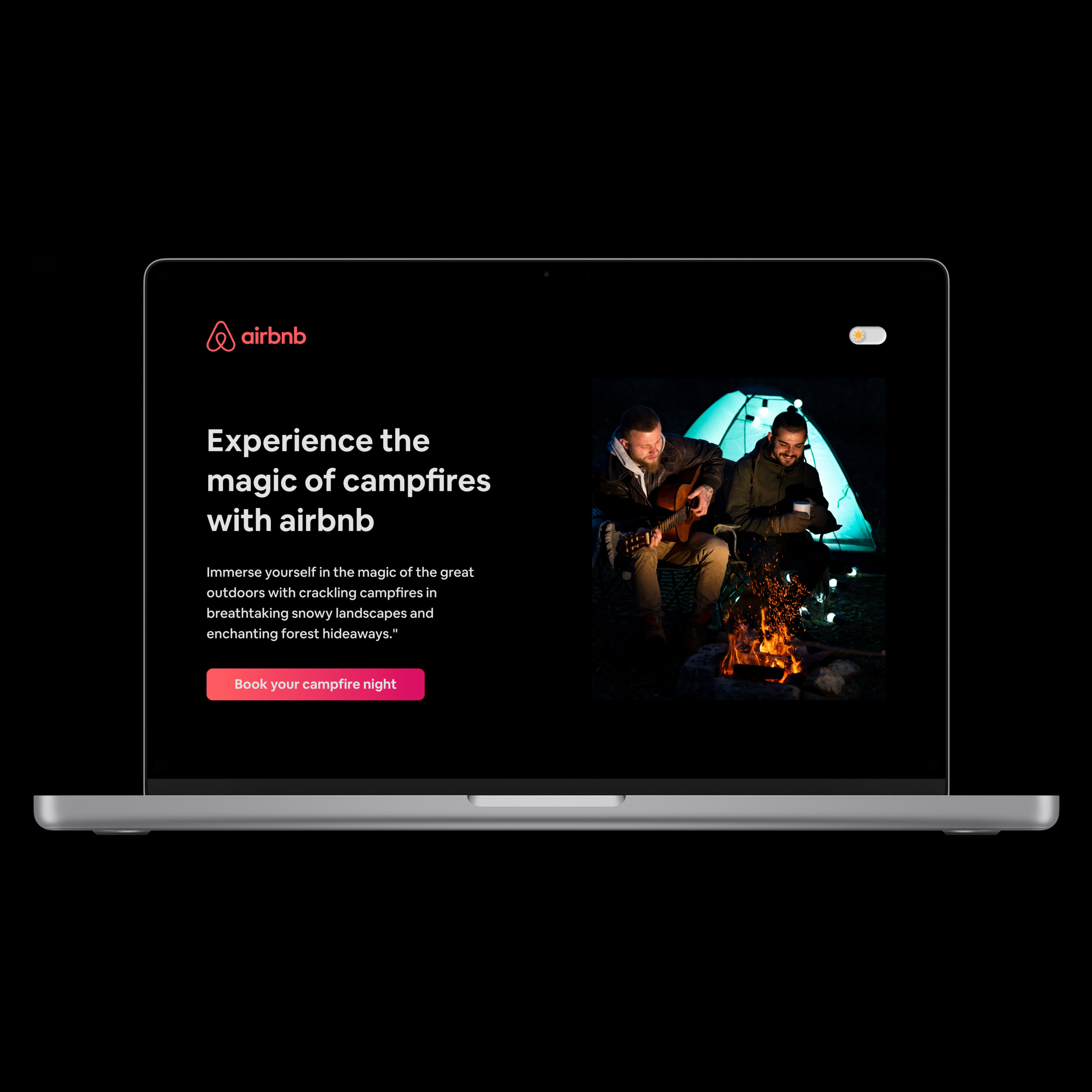 Use Case Scenario - To Book Campfire Services via airbnb, whether it is snowy landscapes or enchanting forest hideaways, with a toggle button interaction, also showing Light mode(for Snowy landscapes) & dark mode(for Forest getaways) effects.