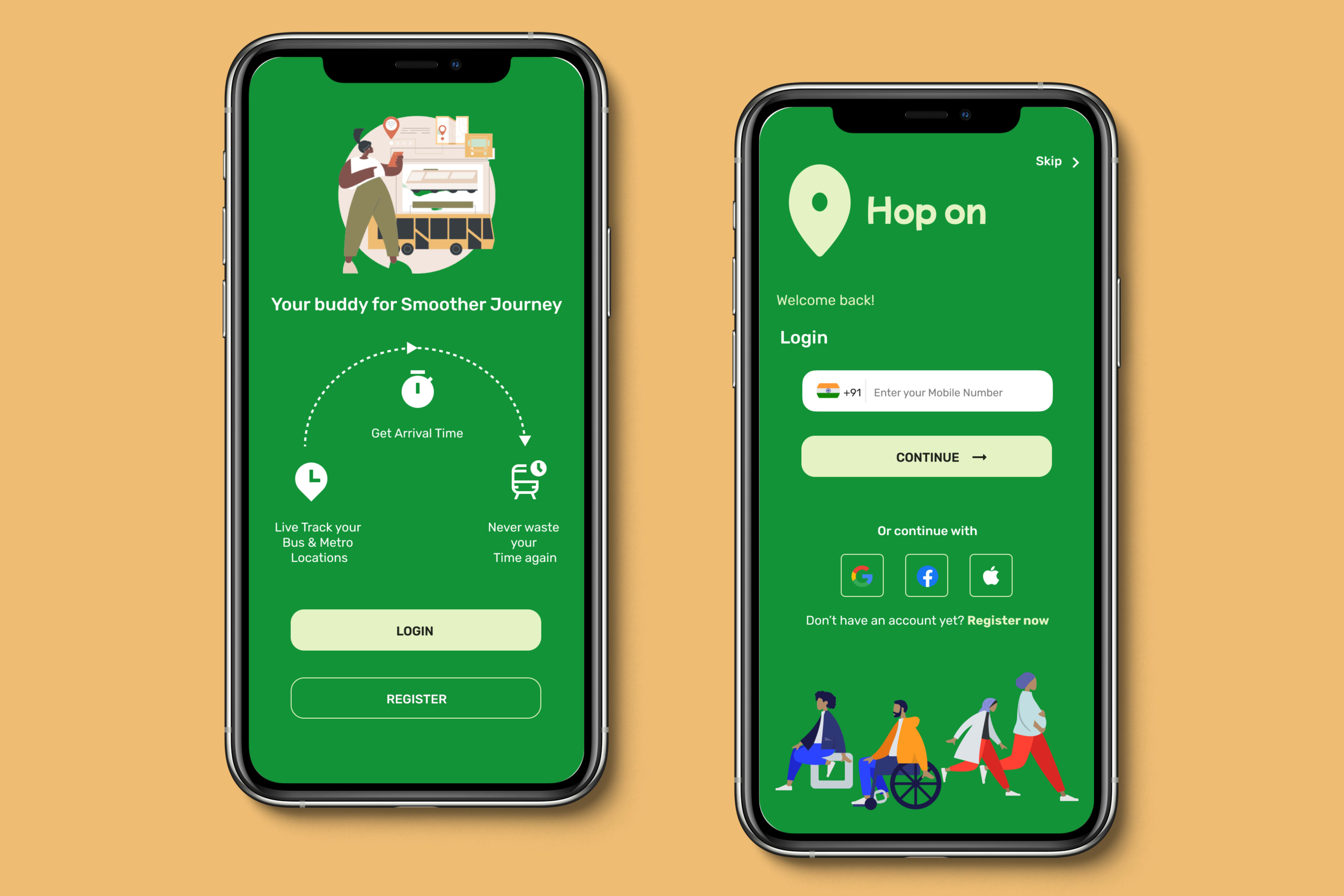 Hop on is an app design concept - your buddy to Track the Live Locations & Arrival Times of nearby Buses & Metros - aimed at making your commute Smoother.