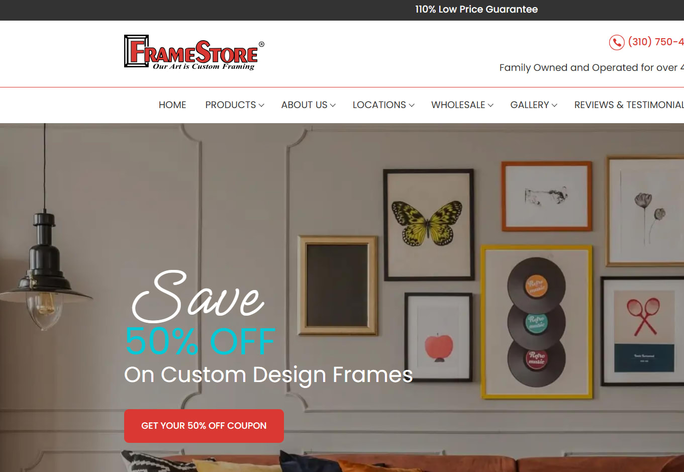 A custom photo and memorabilia framing company with 18 physical stores across Los Angeles. The business specializes in framing a wide range of items — from pictures and paintings to sports jerseys, certificates, and collectibles. They operate purely offline (no ecommerce), making local SEO and in-store visit intent their top priorities.