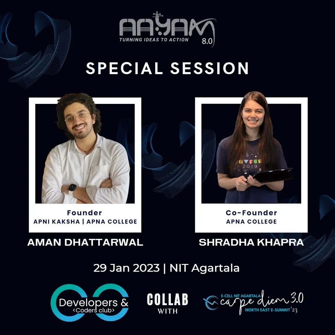 Made a special session poster for the speaker session of Aman Dhattarwal and Shradha Khapra under the banner of Entrepreneurship Cell and Developers and Coders Club NIT Agartala.
