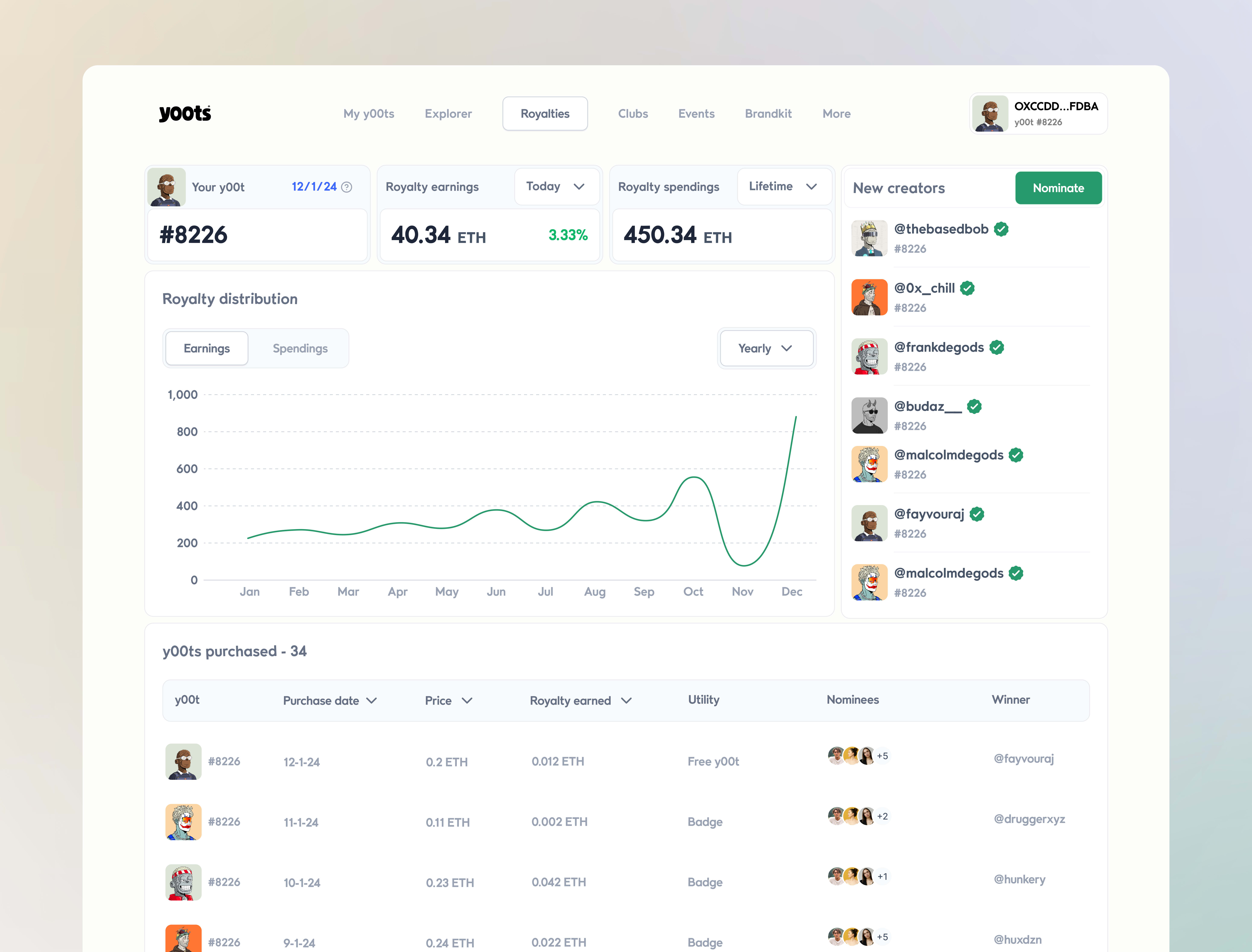 As part of a design bounty by y00t hosted in partnership with Superteam Earn, I designed a dashboard for y00ts holders to be able to monitor the progress of royalties and see how they're being purchased, what they're being used for and who's benefitting from nominations on X. Check it out!