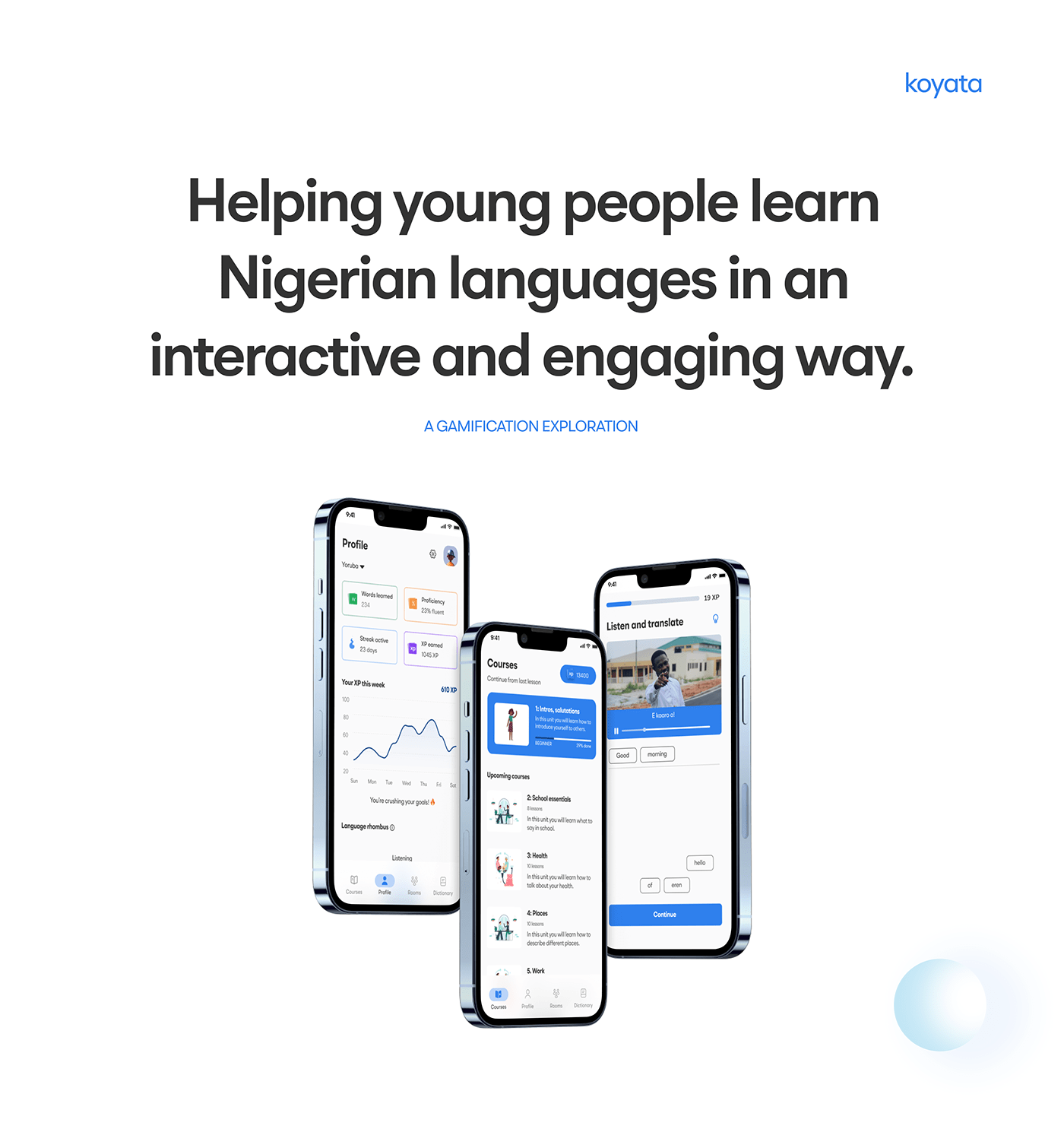 Koyata is a language learning application that leverages white hat gamification techniques to help young people learn Nigerian languages while also teaching them a thing or two about history. I designed a mobile app with 40+ screens