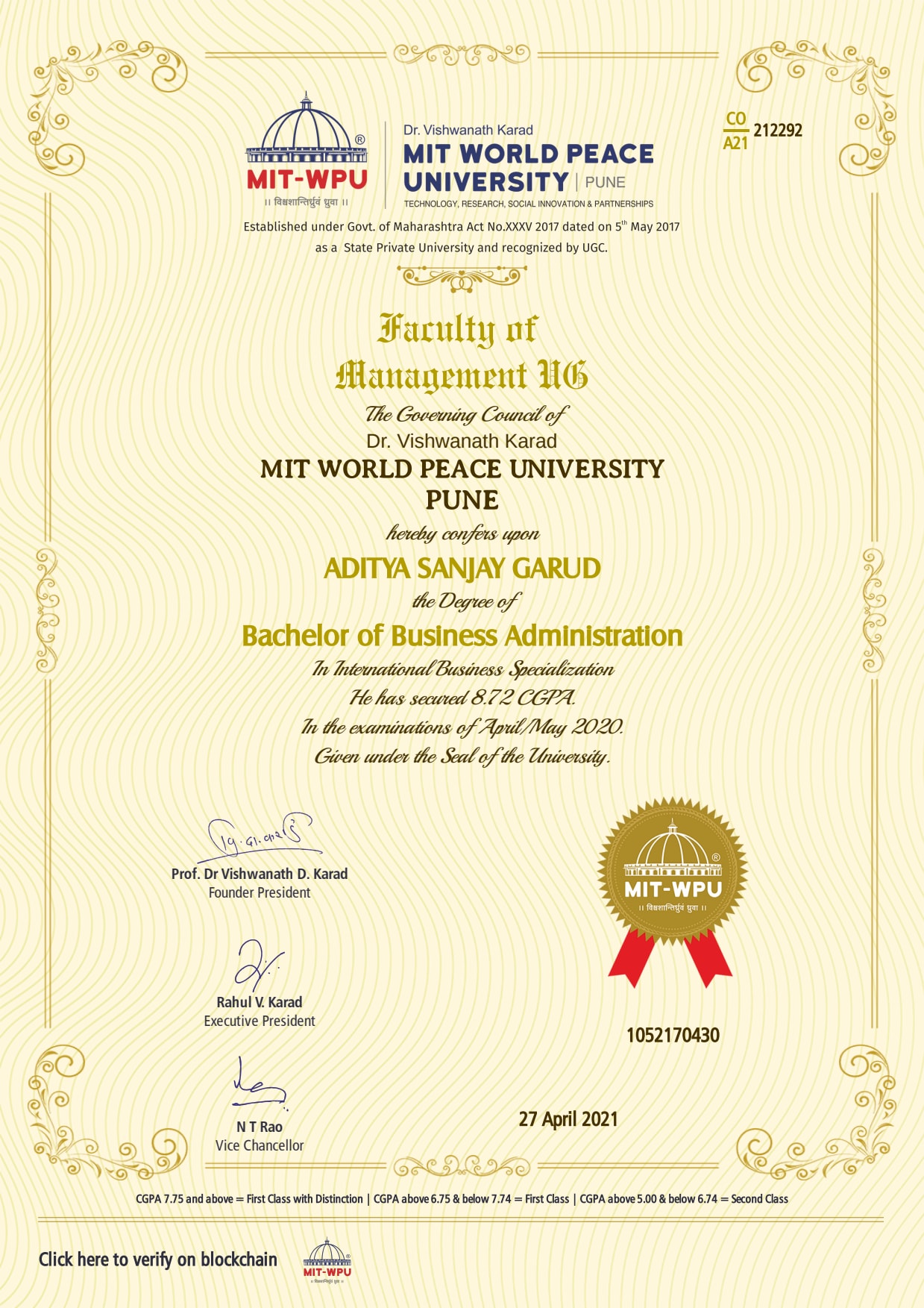 Bachelors of Business Administration certificate with 8.72 CGPA