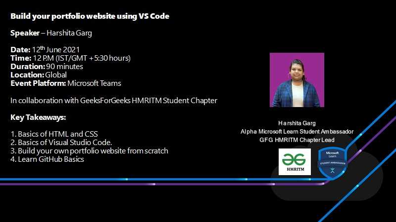 Geeks for Geeks HMRITM has organized a 2-Day workshop on "HTML & CSS" in collaboration with Microsoft Learn Student Ambassador. The event was conducted on 12th & 13th June 2021 (Sat & Sun) at 12:00 PM IST. I was the speaker for Day 1 and it was It's beginner-friendly for all the inspiring web developers.