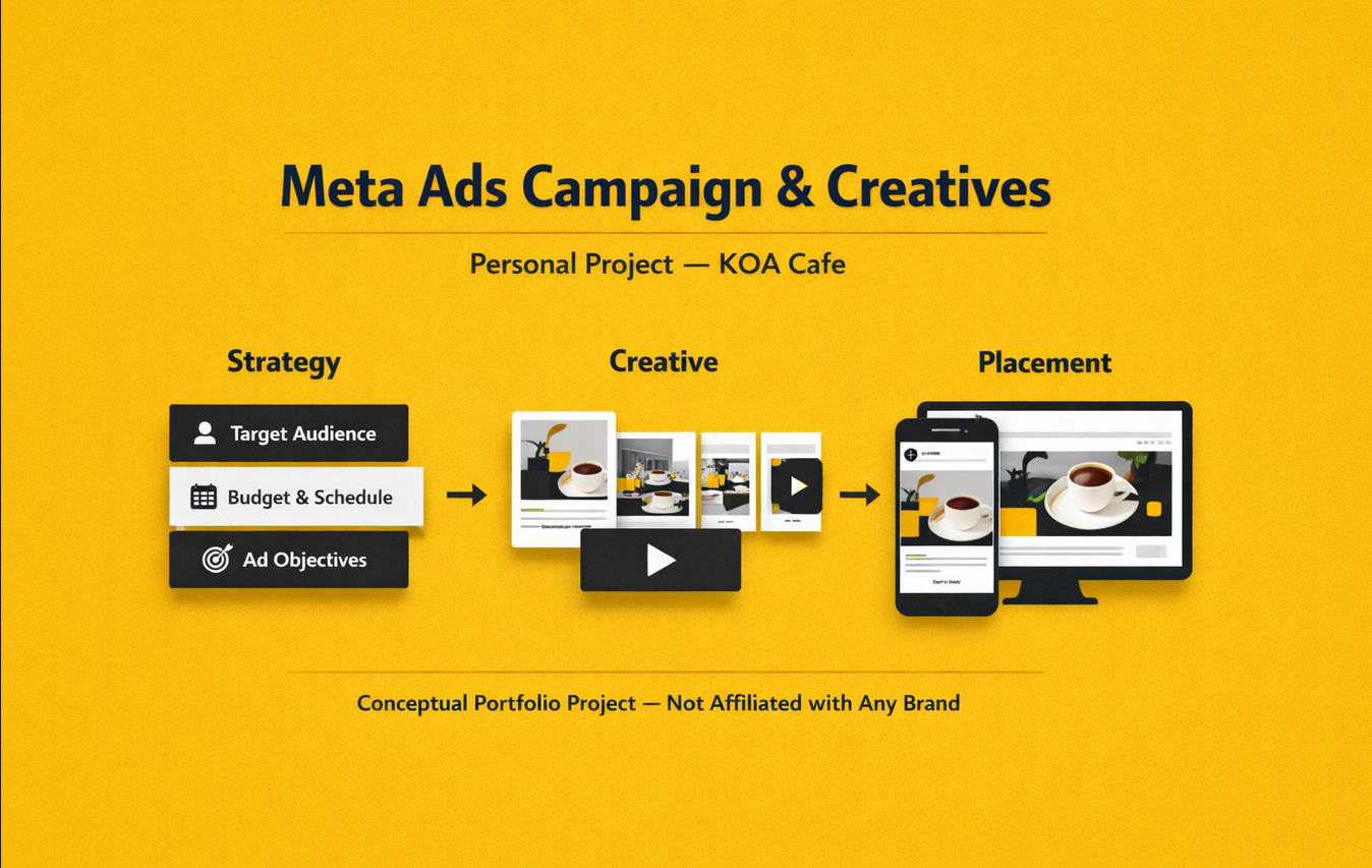 Designed a complete dummy Meta Ads campaign for KOA Cafe, covering strategy, audience segmentation, and creative execution as a personal concept project. The project highlights campaign planning, creative consistency, and performance-focused ad design.