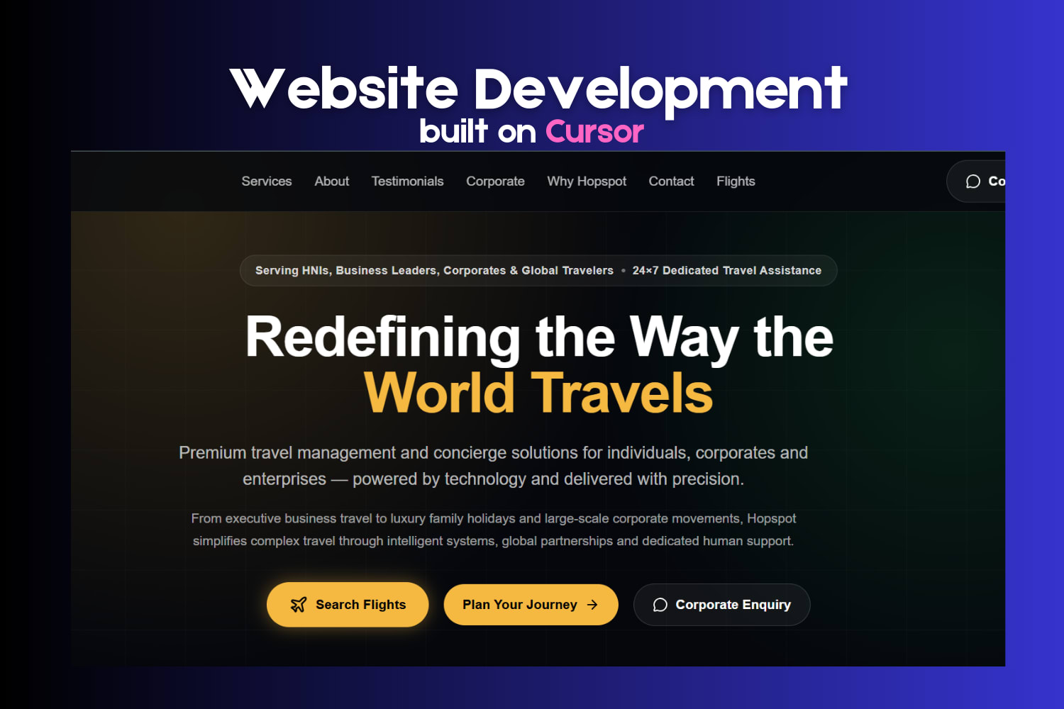 Built the official website for Hopspot, a corporate travel services company, using Cursor. Designed the platform to streamline travel enquiries, flight searches, and corporate booking requests through a clear and conversion-focused interface. Enabled the company to centralize inbound travel requests and present its services digitally for the first time.