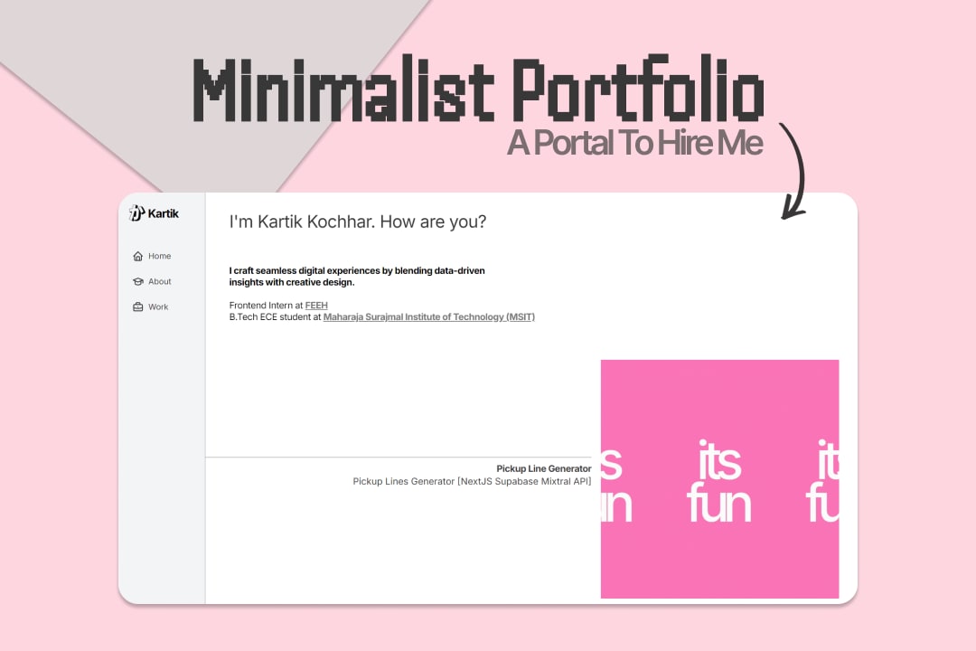 This project is my personal portfolio, designed and developed from scratch with a focus on minimalism and user experience. Built using modern web technologies like NextJS and TailwindCSS, the portfolio is visually appealing while maintaining a clean, easy-to-navigate interface.