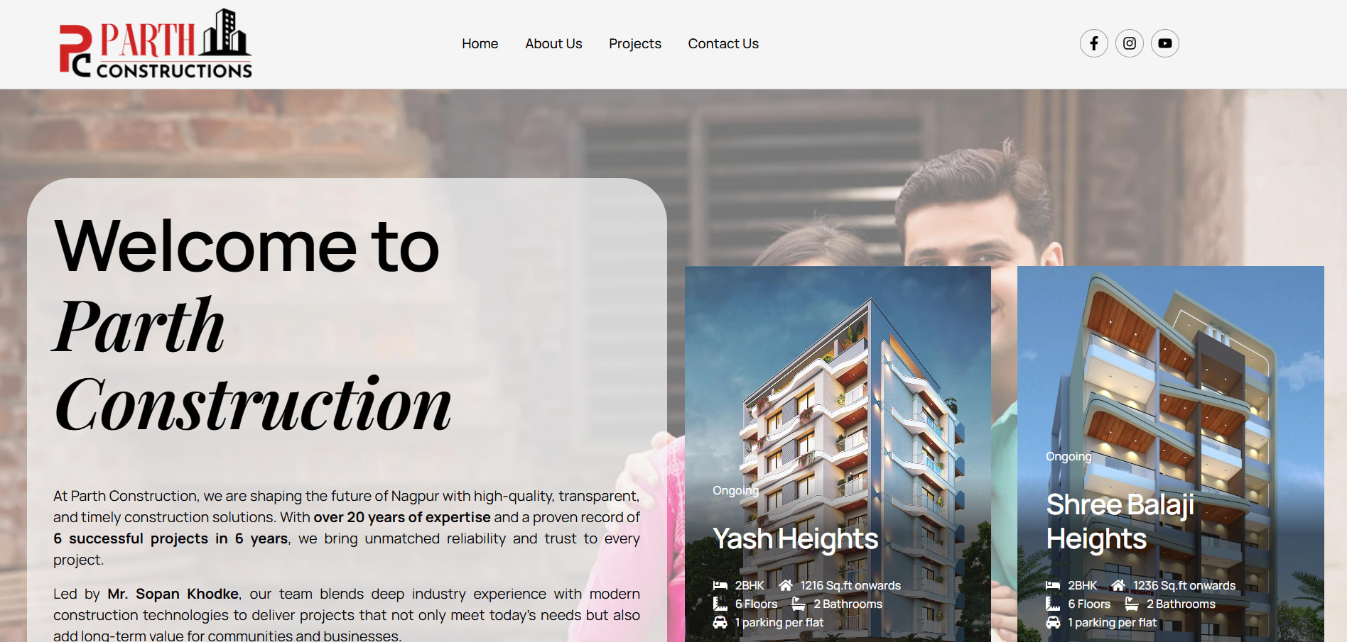 The main objective of this project was to improve the website’s design layout and content presentation for Parth Construction — a growing civil, solar, and infrastructure development company headquartered in India. The focus was to ensure the site appeared clean, modern, and client-friendly, visually representing the firm’s scale of work across residential, solar, and industrial projects.