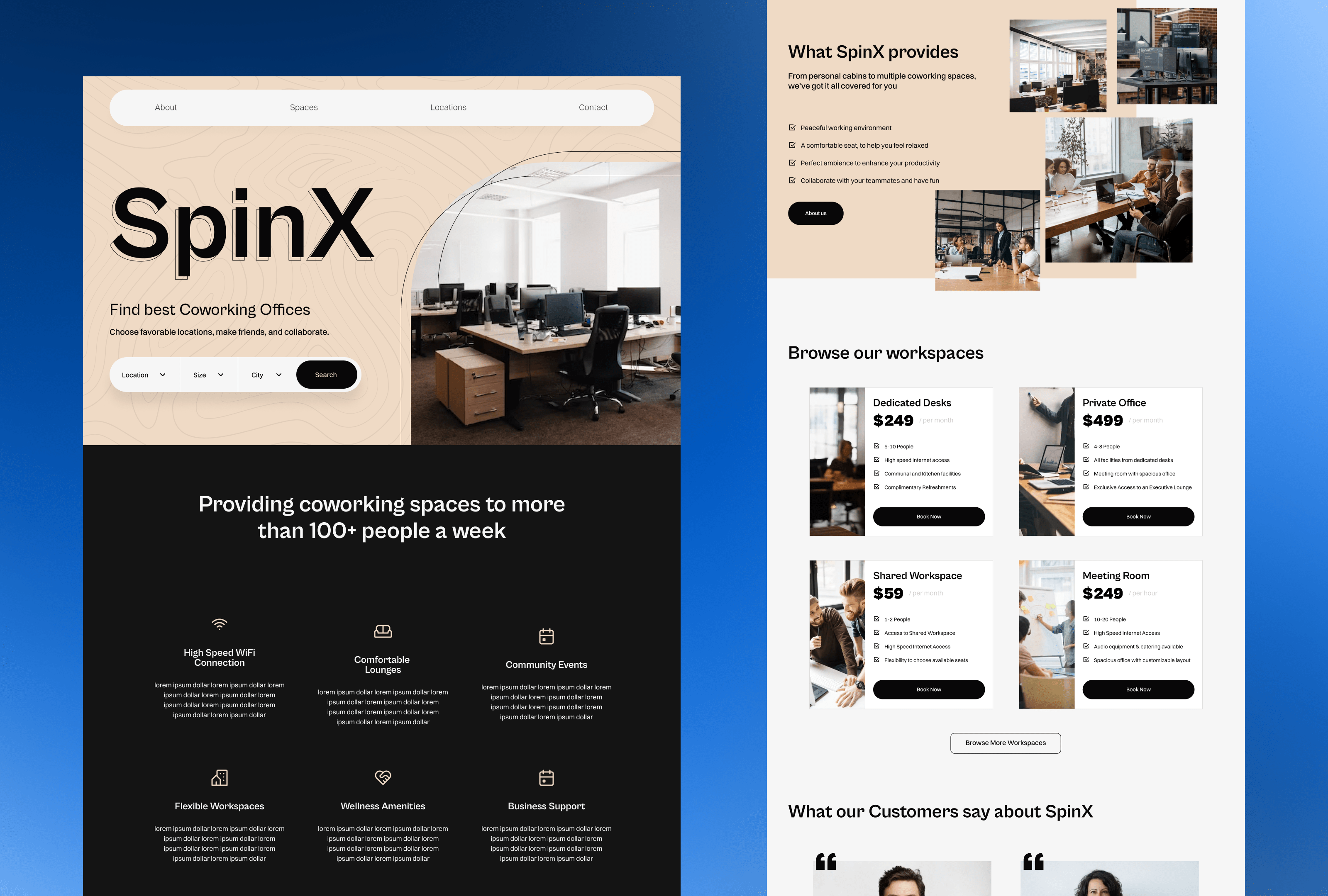 Welcome to the landing page for SpinX, a visionary coworking space designed to revolutionize your work environment and boost productivity. This project is proof of work, showcasing the UI/UX design created exclusively for SpinX. Please note that this is a dummy project with no affiliation with real-world corporations.