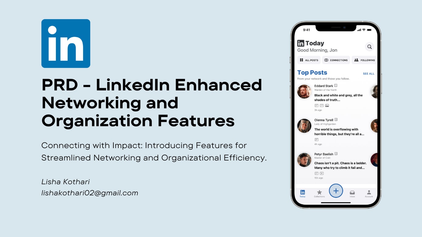 Objective: The objective of this PRD is to outline key feature enhancements for LinkedIn's platform, focusing on improving connection management, expertise grouping, and item organization. By addressing these areas, I aimed to provide LinkedIn users with a more streamlined and personalized experience, allowing them to effectively manage their connections, showcase their expertise, and organize their saved items.