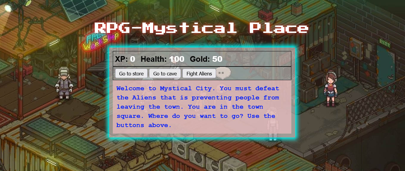 Welcome to Mystical City. You must defeat the Aliens that is preventing people from leaving the town. You are in the town square. Where do you want to go? Use the buttons above.