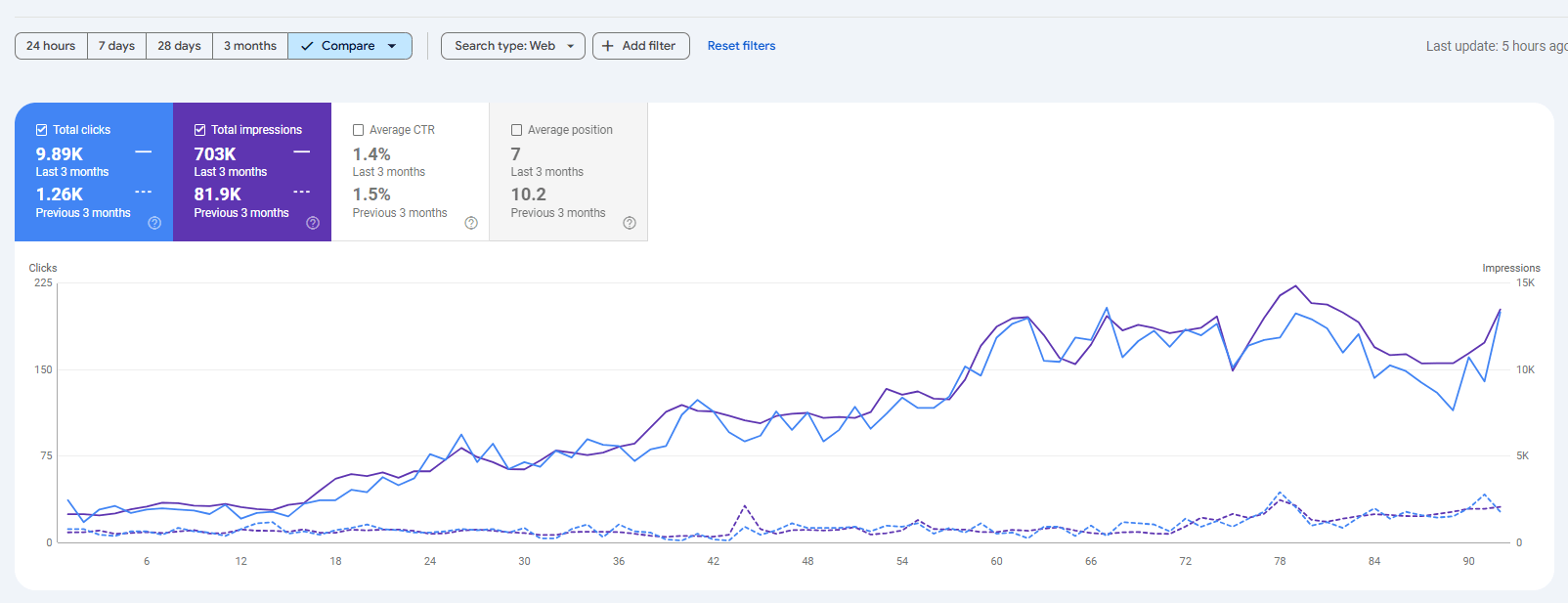 In just 90 days, I achieved a remarkable 684% increase in organic clicks and a 758.3% boost in organic impressions for my client. The proof is in the results—far surpassing the promise of doubling traffic.