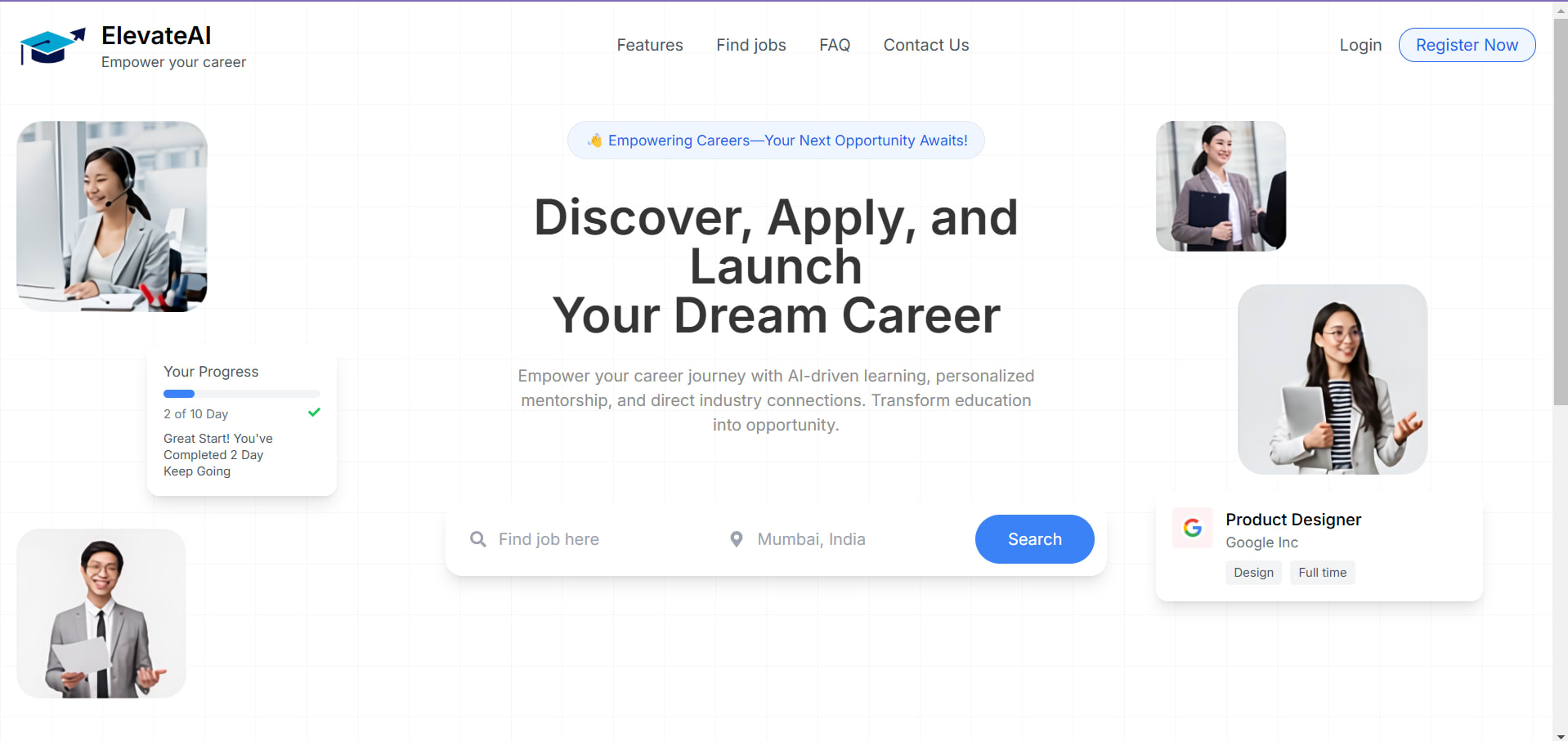 ElevateAI brings together three key stakeholdersβstudents, recruiters, and mentorsβon a single AI-powered platform designed to enhance learning, hiring, and mentorship.