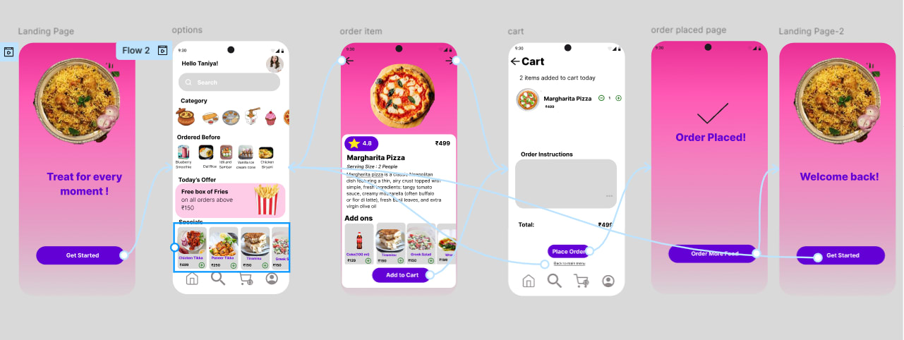 Overview: A mobile-first food delivery prototype designed to simplify ordering, personalize user journeys, and drive higher engagement through offers and upsells. The app balances delightful UI design with functional flows that reduce friction and encourage repeat usage.
