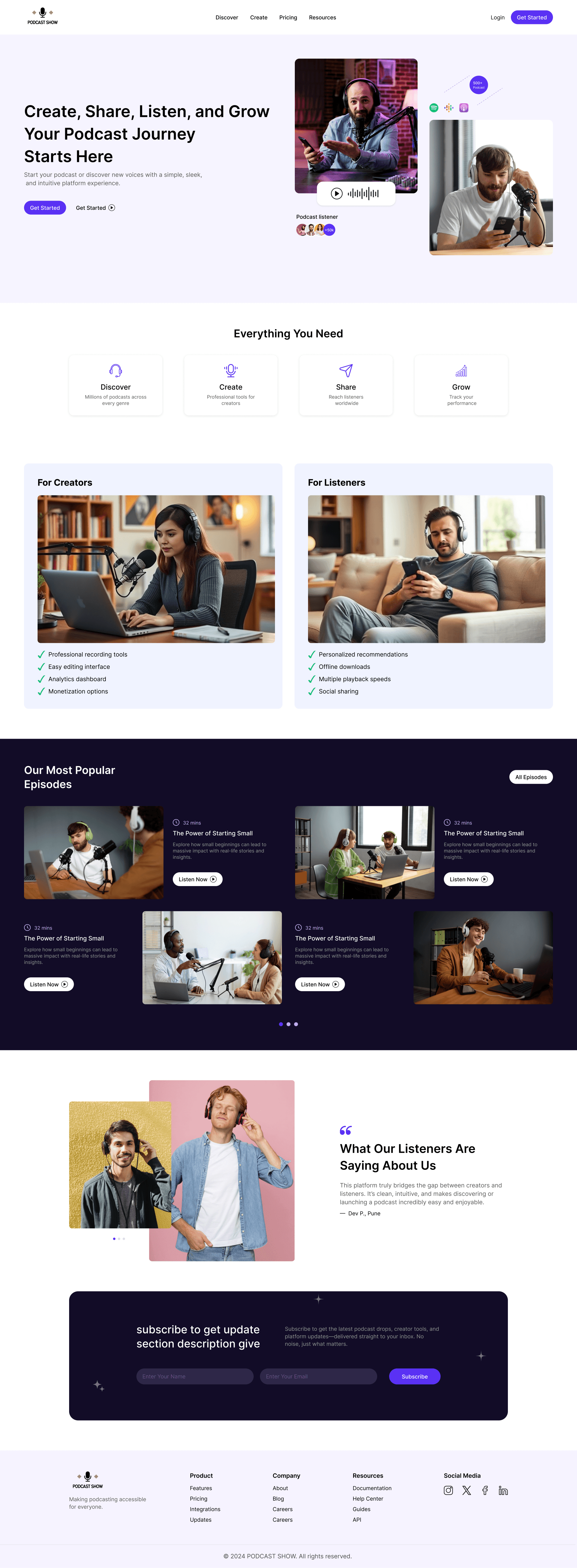 A clean, user-centric landing page designed for a podcast platform that empowers creators and engages listeners. The interface is minimal, intuitive, and responsiveāfeaturing smooth navigation, bold typography, and essential features like create, upload, edit, browse, and listen. Built to deliver a seamless experience for discovering and managing audio content.