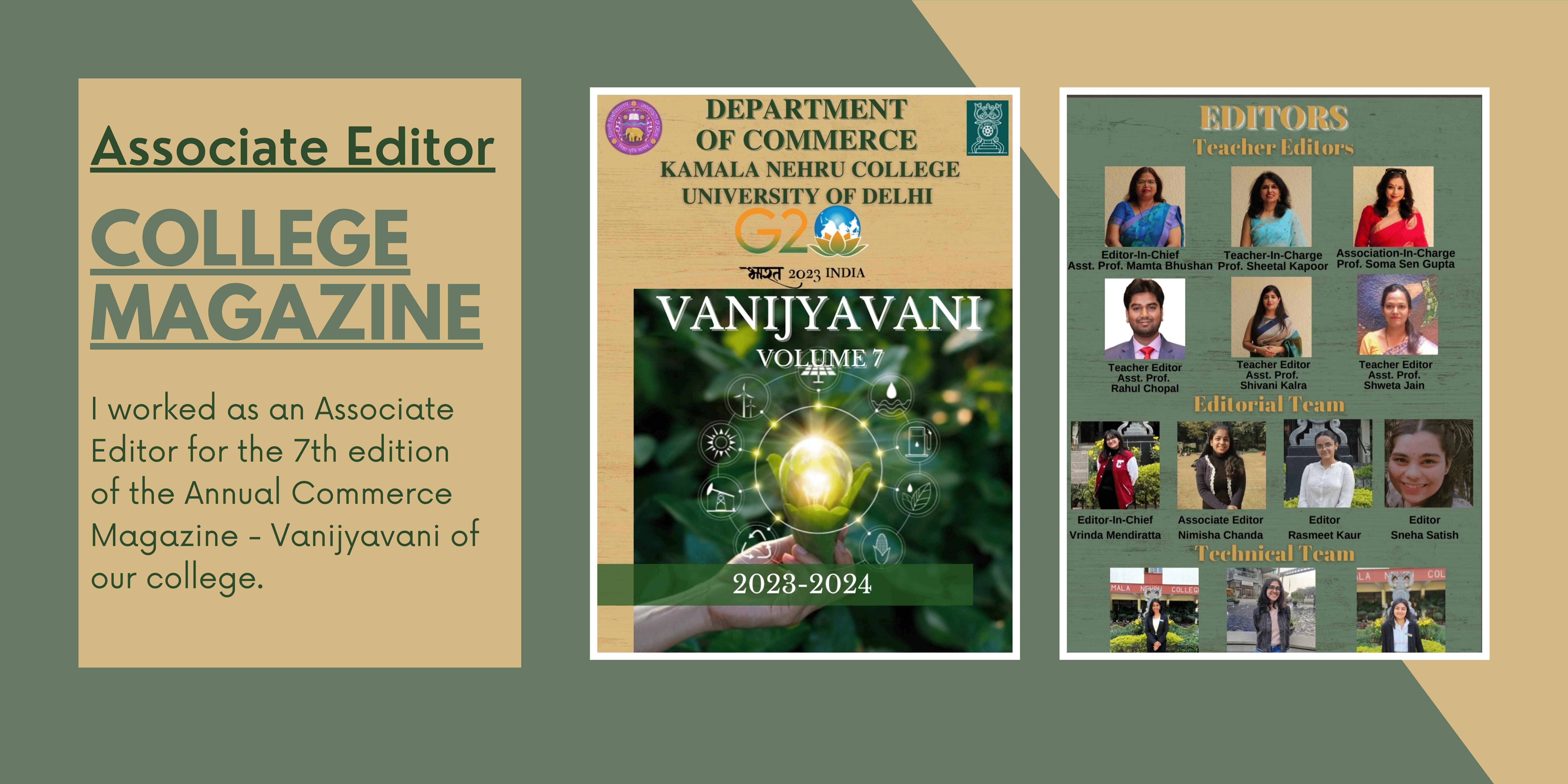 Objective: The objective of this project was to publish the 7th edition of the Annual Commerce Magazine of our college - Vanijyavani. My role as an Associate Editor was to edit the articles according to the magazine framework, coordinate between the content and graphics team, work on other pieces such as commerce quiz, facts, and reports of the annual events of our department.