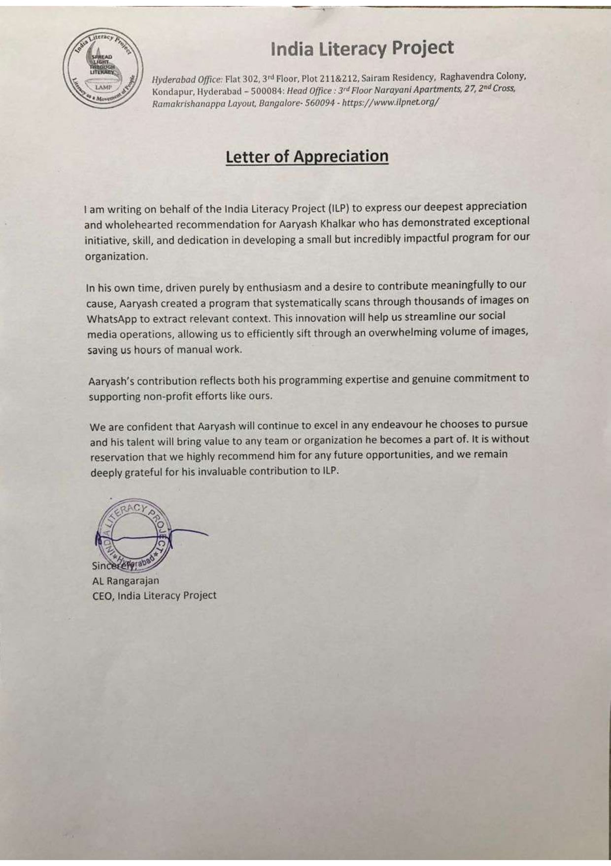 I was honoured to receive a letter of appreciation from the Indian Literacy Project (ILP) for developing an AI tool that simplifies WhatsApp media management. The tool automatically organizes images by year, month, and date while generating a structured text file with sender details, timestamps, and captions, making it easier for ILP to handle large volumes of shared media from groundwork. As a non-profit dedicated to education and literacy, ILP benefited from this solution by streamlining its documentation process and improving accessibility. Working closely with ILP’s leadership, including CEO Asuri Lakshminarasimhan Rangarajan, Padmaja Sathyamoorthy, and Archana Sali, was an enriching experience, and contributing to their impactful mission was truly rewarding. Thanks to my co-founder and friend, Abhi Pareek, for his collaboration and dedication. This achievement inspires us to keep building solutions that create real change.