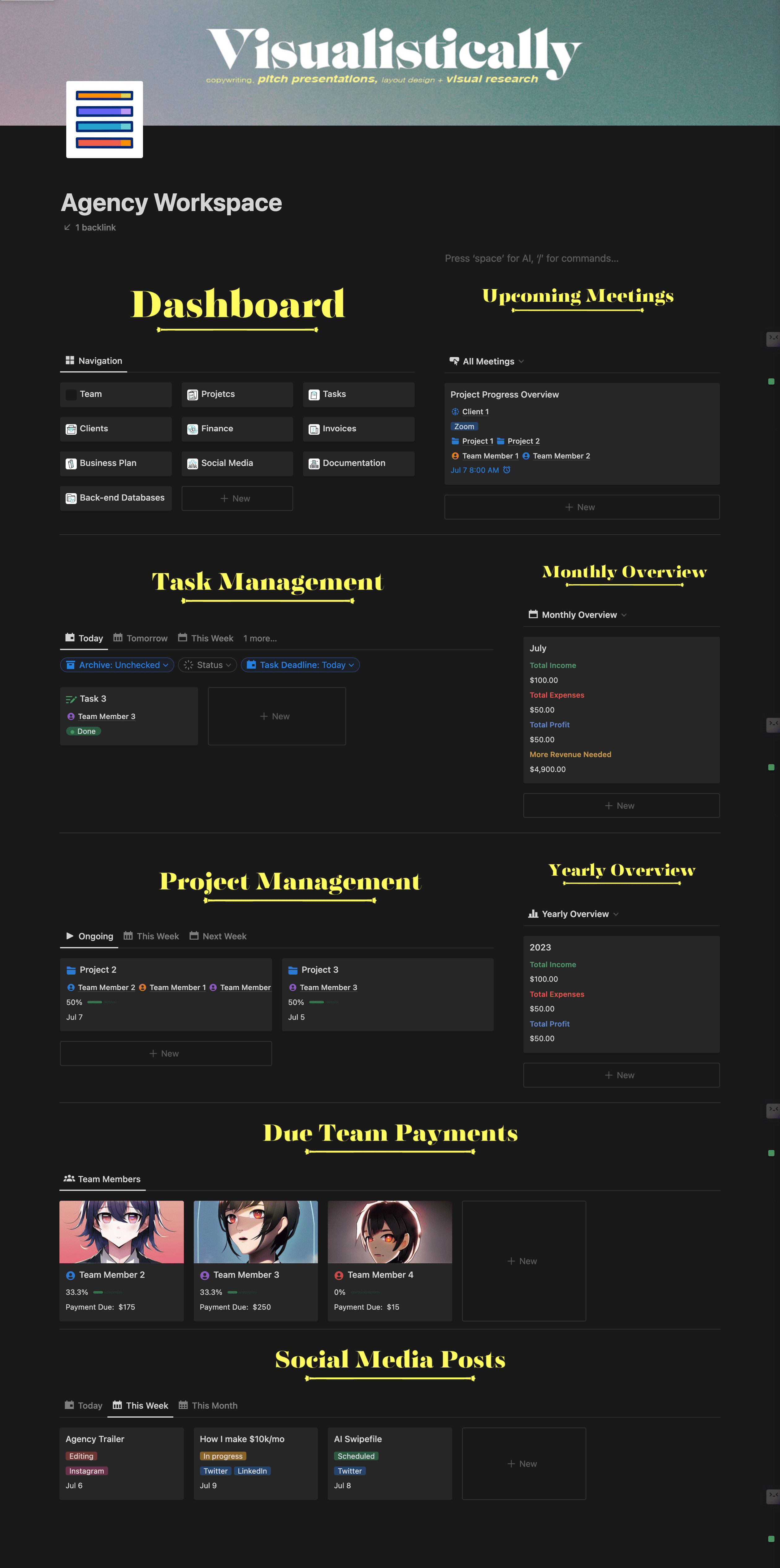 I worked with the Visualistically team, and closely with the founder, Eric Mejia, to build a personally curated Agency Workspace for the team members to manage anything and everything related to the agency.