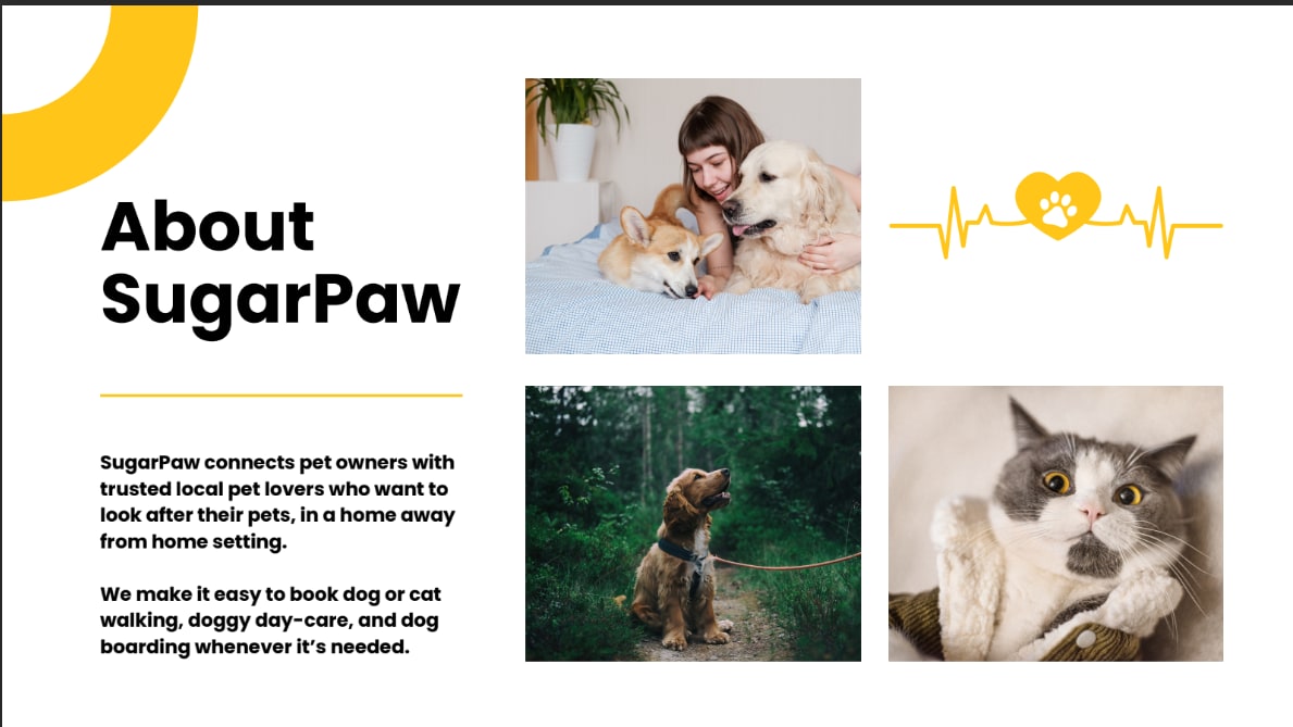 SugarPaw connects pet owners with trusted, local pet sitters who provide home-like pet care. Whether it's dog walking, day-care, or boarding, SugarPaw ensures a comfortable and convenient experience for pets and their owners.I made this using canva.