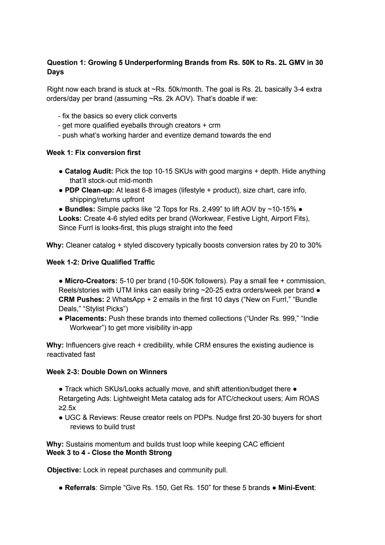 Grow 5 underperforming brands on Furrl from under Rs. 50K/month to Rs. 2L/month GMV within 30 days, and scale Shopify brand onboarding from 10 to 15 brands/month using the same team.