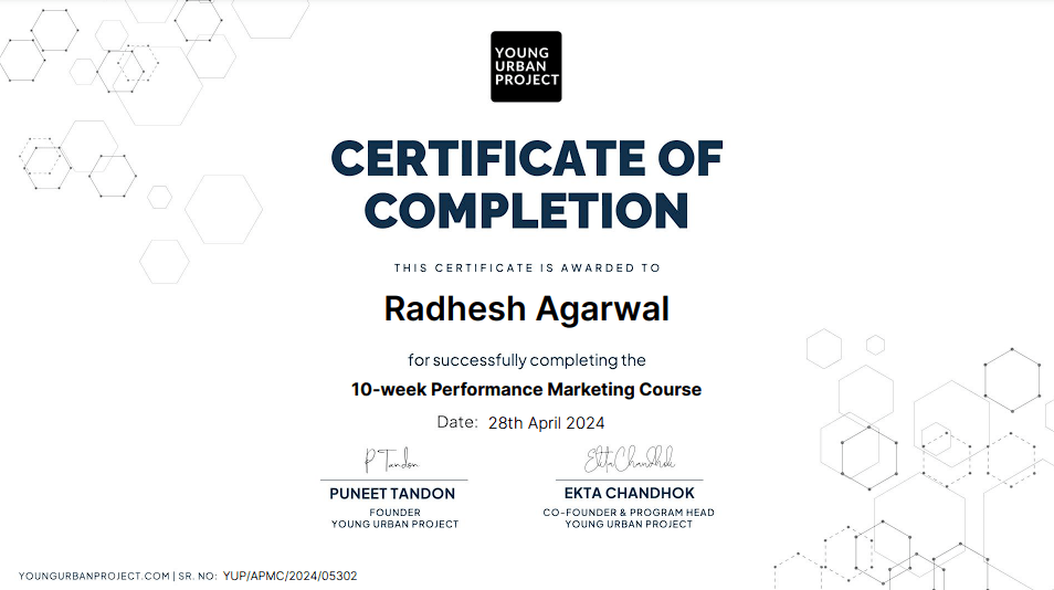 After completing the Advanced Performance Marketing course from Young Urban Project, where I discovered my passion for understanding customer psychology and its impact on sales. I further expanded my knowledge with Umar Tazkeer’s D2C performance marketing course, gaining practical, live insights into the field.