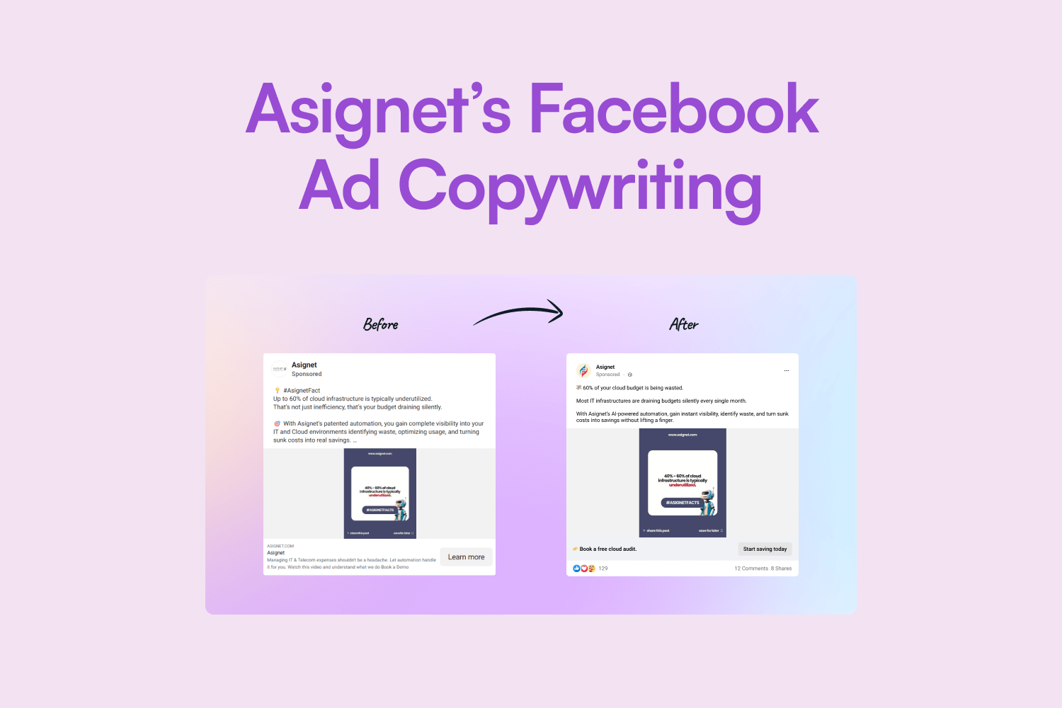 Asignet’s original Meta ads are visually clean but suffer from vague messaging. They mention automation, savings, and cloud but don’t hook readers or highlight direct benefits clearly.
