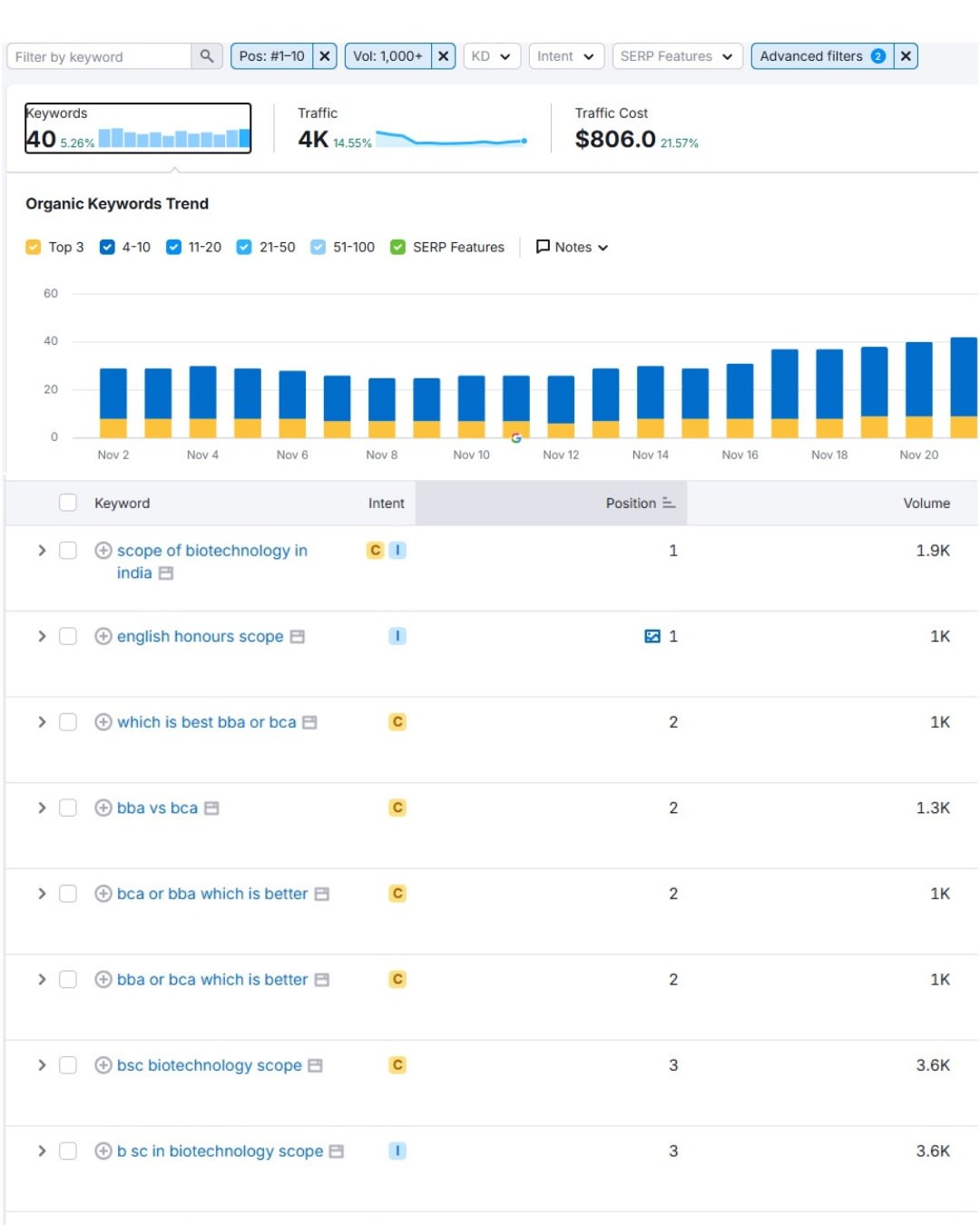 In just 20 days, I doubled 1,000+ volume keywords from 20 to 40, resulting in a 14.55% increase in organic traffic.