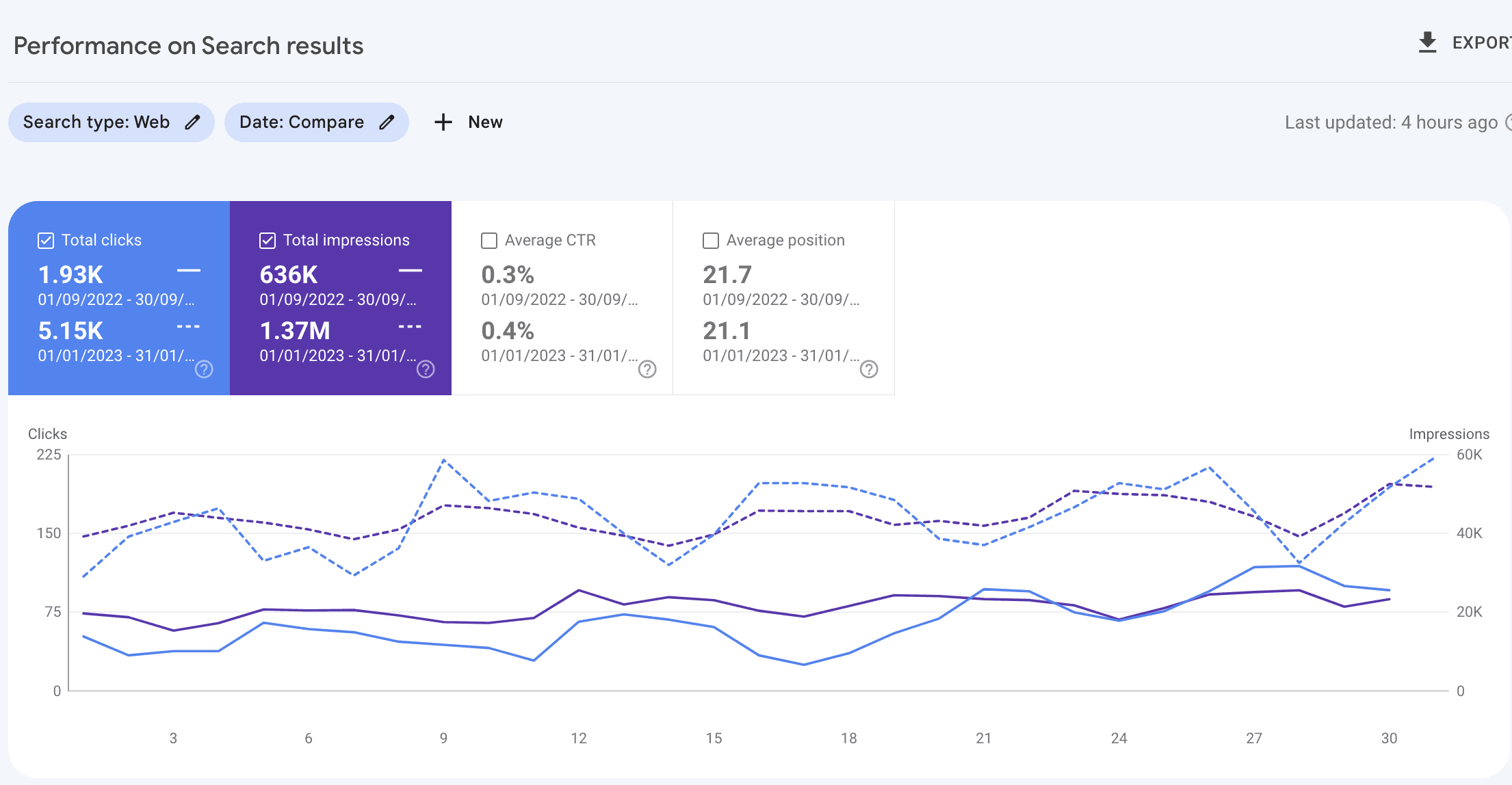 I say, you give me 90 days and I double your traffic. The screenshot proves not only a double but more than double the increase in organic clicks for my current client.