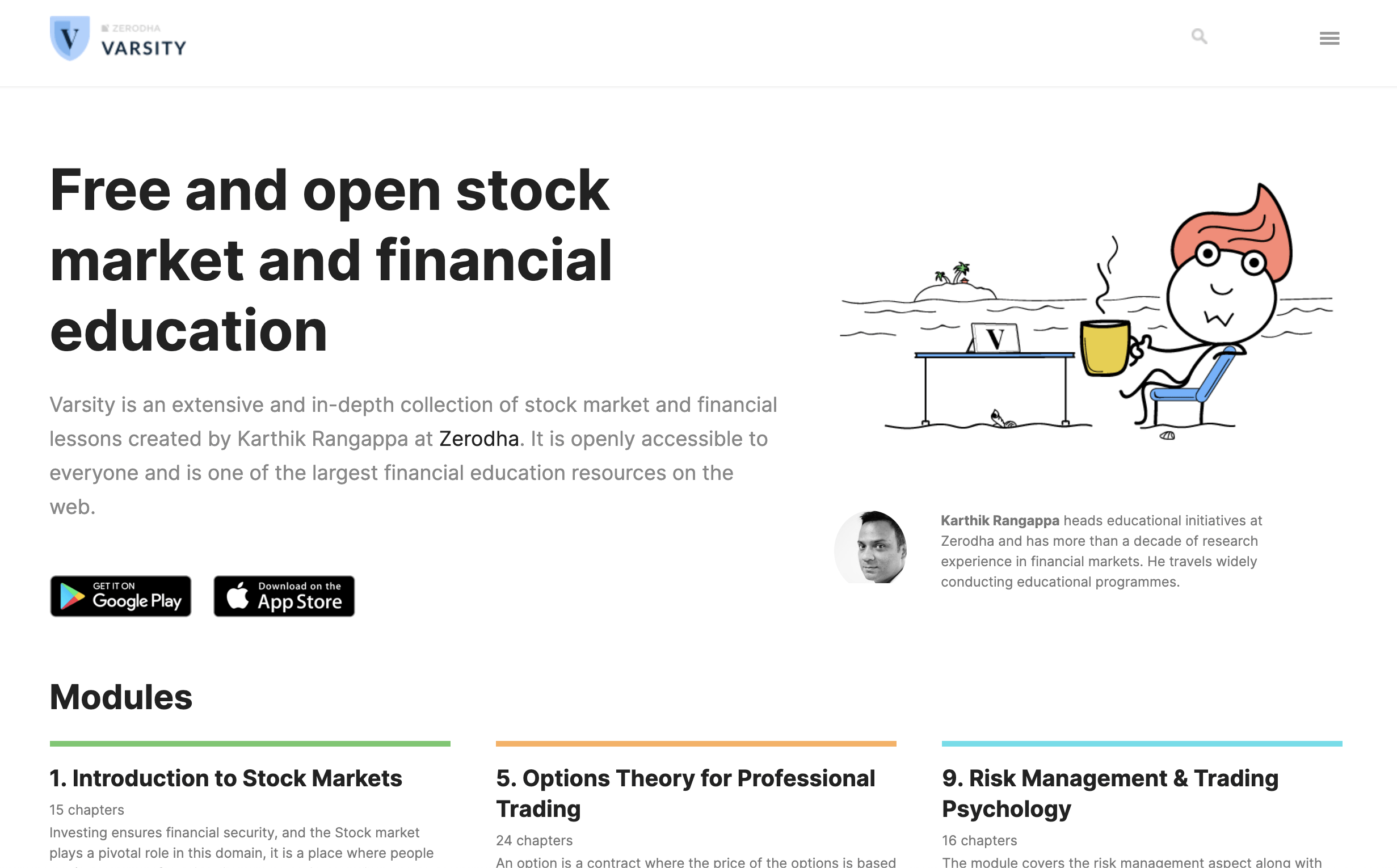 Everything you need to learn about Investing in the Stock Market. Zerodha’s Varsity is the perfect place for someone who is new into this domain and wants to learn from basics about what stock market is, how it works, and all their concepts about it. Not only stock markets, but Varsity is also rich with information about other markets like currency, commodities, and derivatives.