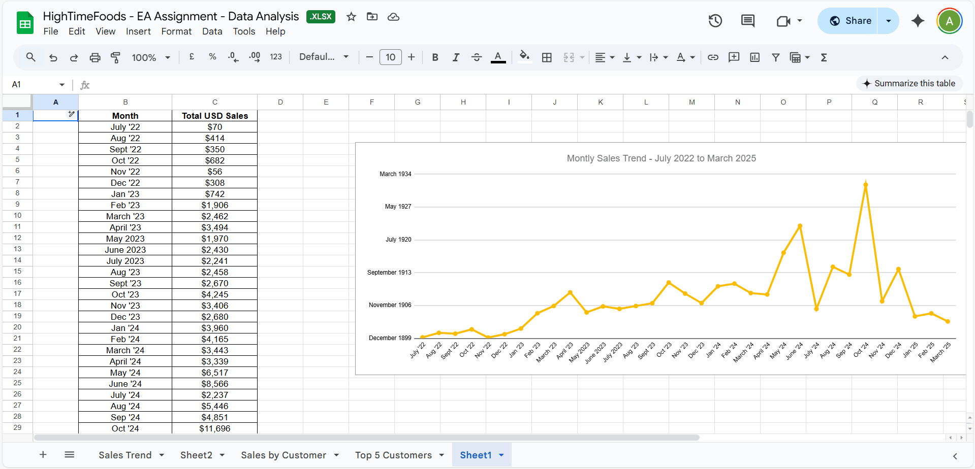 Peak revenue in Dec ’24 ($5.2K), slowdown by Mar ’25 ($1.3K).