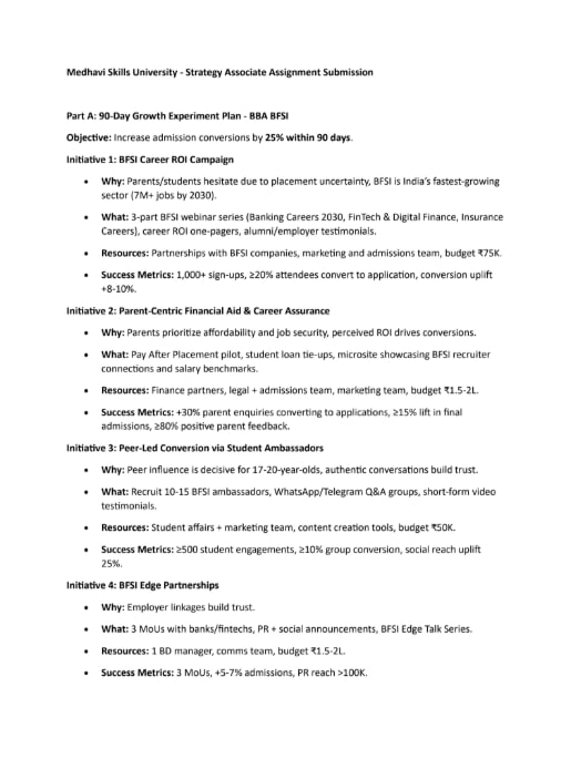 Designed a 90-day growth experiment with 4 initiatives: BFSI Career ROI webinars, parent-centric financial aid & career assurance, peer-led student ambassador program, and BFSI Edge employer partnerships.
