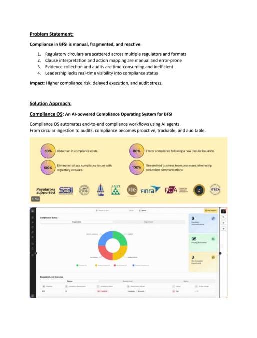Transform compliance for BFSI institutions from a manual, reactive, and fragmented process into a proactive, AI-driven operating system that automates circular tracking, clause interpretation, task execution, and audit readiness with real-time leadership visibility.