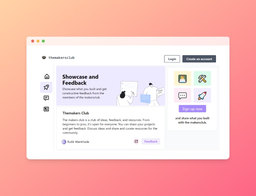 The makersclub is a social platform for makers where you can showcase what you built, ask for constructive feedback, discuss ideas, and even share resources with everyone.