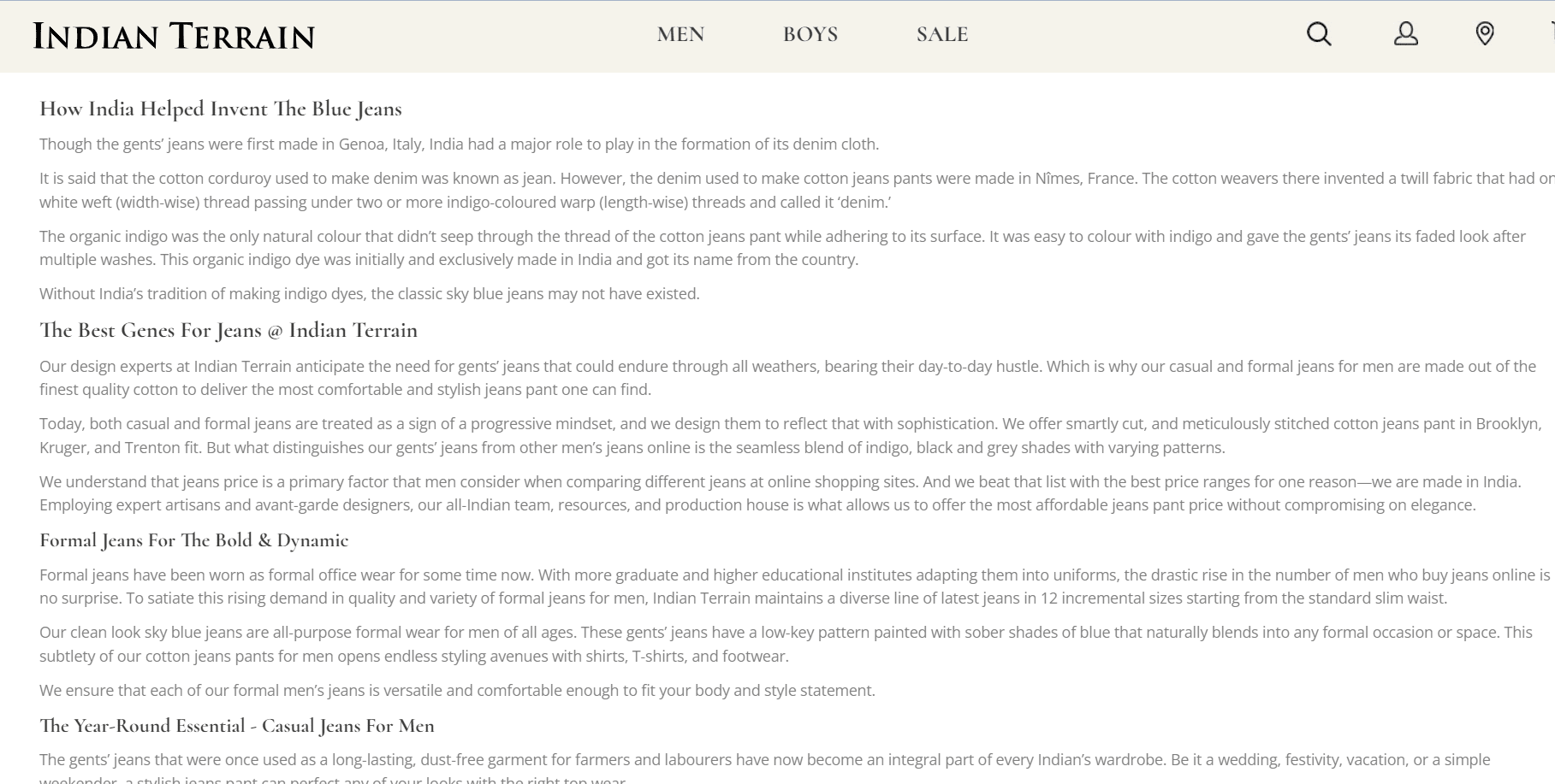 Multiple pages of the apparel brand Indian Terrain needed fresh branded content that creatively talked about their unique products while helping in SEO for key searches. The Jeans section is one of the multiple product pages I have ghostwritten.