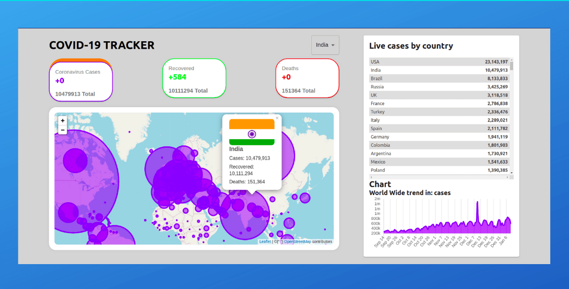 A Real-time COVID-19 information tracker web application purely coded in REACT.js. There is a table showing the list of countries sorted by the affected cases and shows the number of total cases per countries. A worldwide map is there showing the areas as Affected, recovery and death cases in the map by colored circles with specific diameters. Technologies used: React.js, fetch API. Styling: Material UI. Modules used: CHART.js, LEAFLET.js. API endpoints: https://disease.sh/v3/covid-19/countries, https://disease.sh/v3/covid-19/all, https://disease.sh/v3/covid-19/countries/. hosted on: FIREBASE