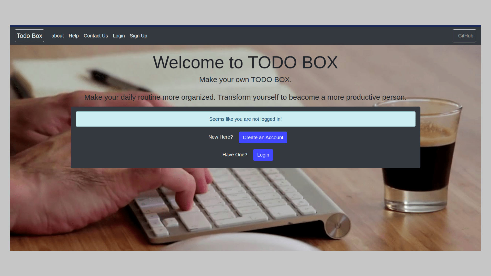 A Full-stack web application to keep track of daily Todo-List. This web application implements all business logic in server side or back-end functionality, all the database operations (CRUD operation), front-end UI rendering. Here an user can Create their own account, If they have one, they can login into their account, they can see their Dashboard where they can: See Previous Tasks, Add New Tasks, Delete Tasks, Update Existing Task, Mark as Done, Mark as Undone any Task. Technologies used in front-end: HTML5, CSS3, JavaScript, Bootstrap 4 . Technologies used in back-end: Django. Database Used: SQLite. Hosted on: heroku (Github Link: https://github.com/sandipan898/Todo-Box)