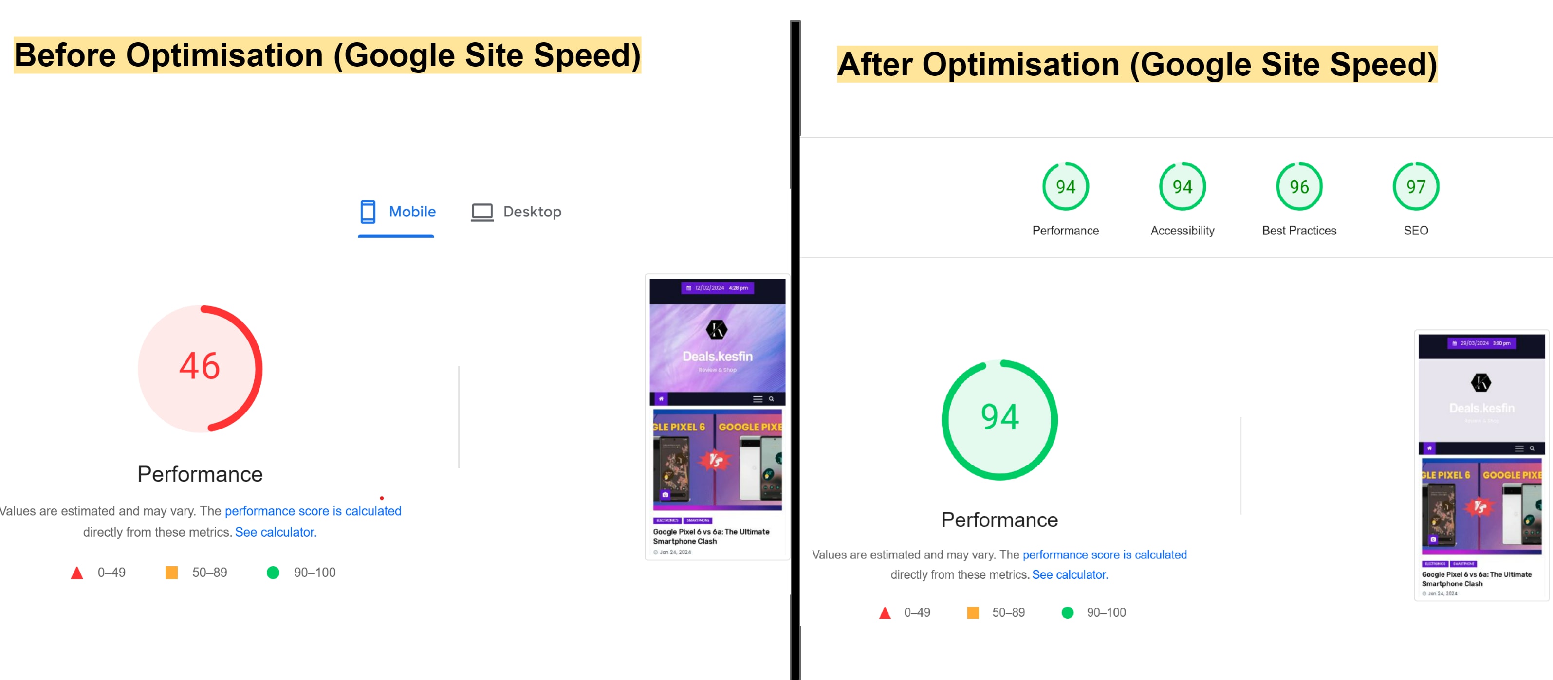 Let's see how the website speed changed before and after optimization. Before, it was running at only 46% of its potential speed. But after making some improvements, it shot up to an impressive 94%. This big jump shows how much better the website works when its speed is optimized. Plus, it helps improve the website's ranking.