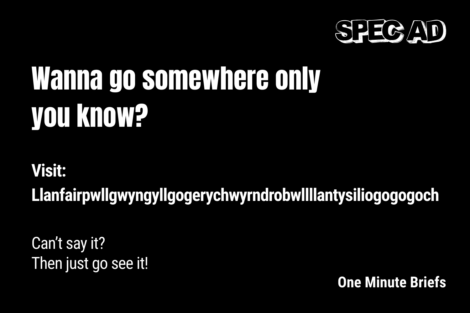 🔮 Concept: A minimalist travel ad turning the town’s tongue-twisting name into a playful hook, using a well-known song lyric, inviting tourists to visit rather than struggle to pronounce it.