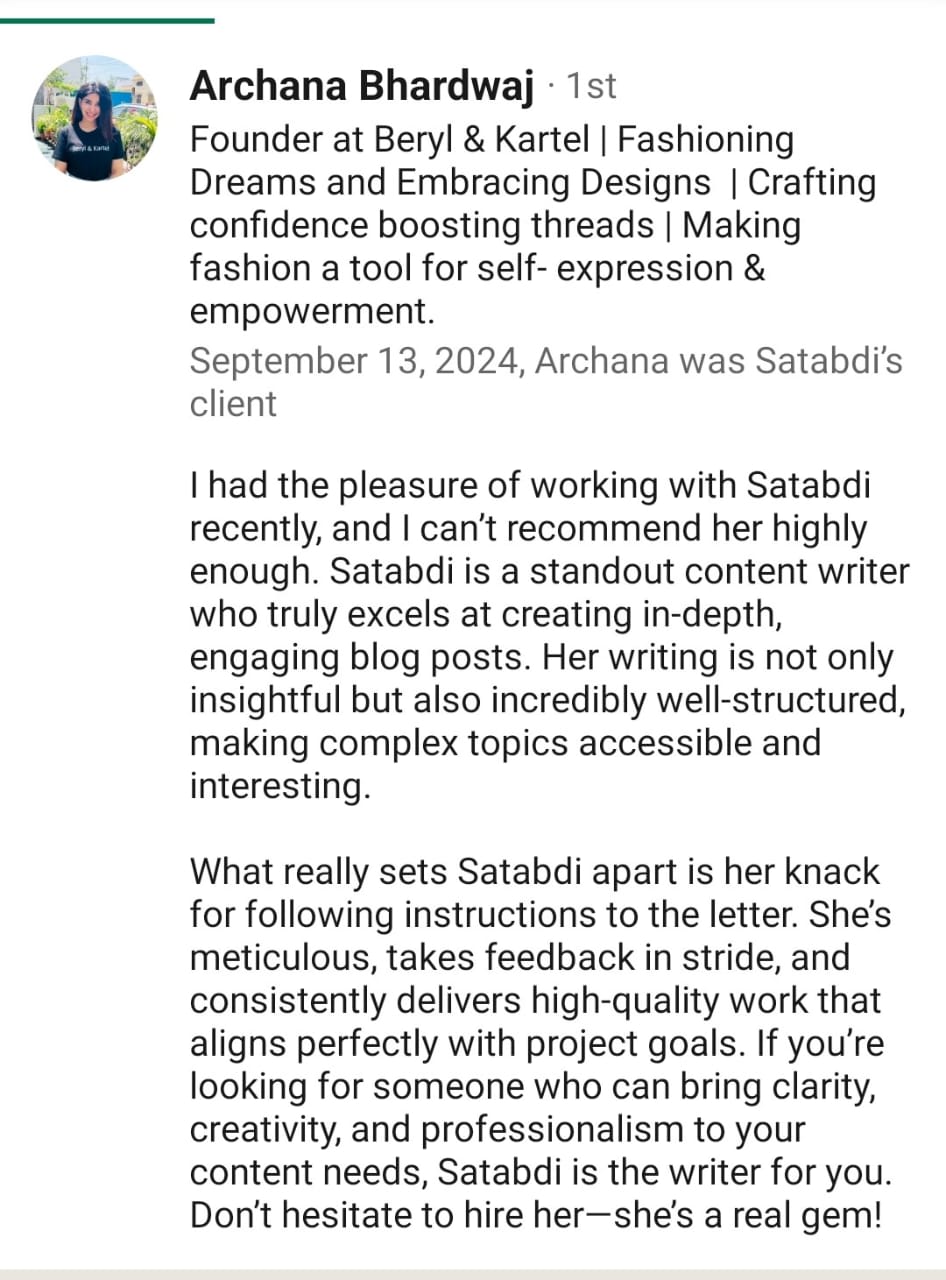 I had the pleasure of working with Satabdi recently, and I can’t recommend her highly enough. Satabdi is a standout content writer who truly excels at creating in-depth, engaging blog posts. Her writing is not only insightful but also incredibly well-structured, making complex topics accessible and interesting.