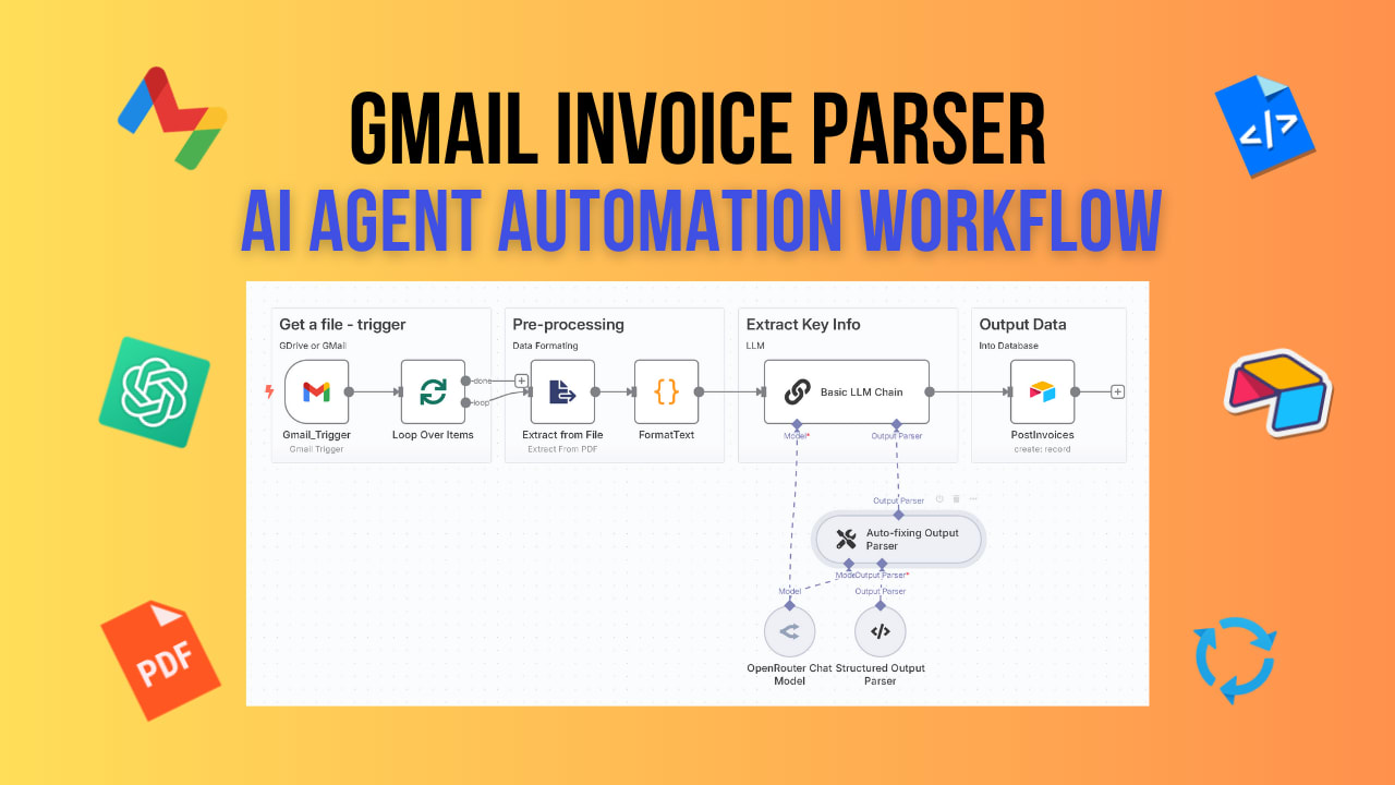 An AI-powered automation that reads Gmail invoice attachments, extracts key fields using LLMs, and stores the results in Airtable — built entirely using n8n.