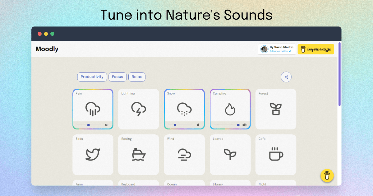 Get a better sense of focus and relaxation by listening to ambient nature sounds. Double your productivity and focus with Moodly, completely FREE.