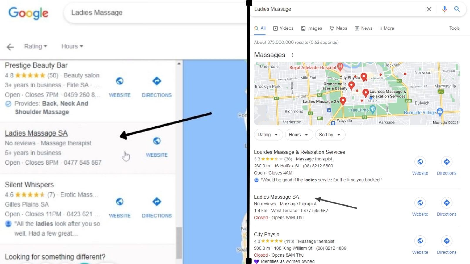 The client’s Google Business Profile was stuck at the 19th position on page 1 for the keyword “Ladies Massage”. Despite being on the first page, low visibility in the lower ranks meant minimal leads and reduced local exposure.