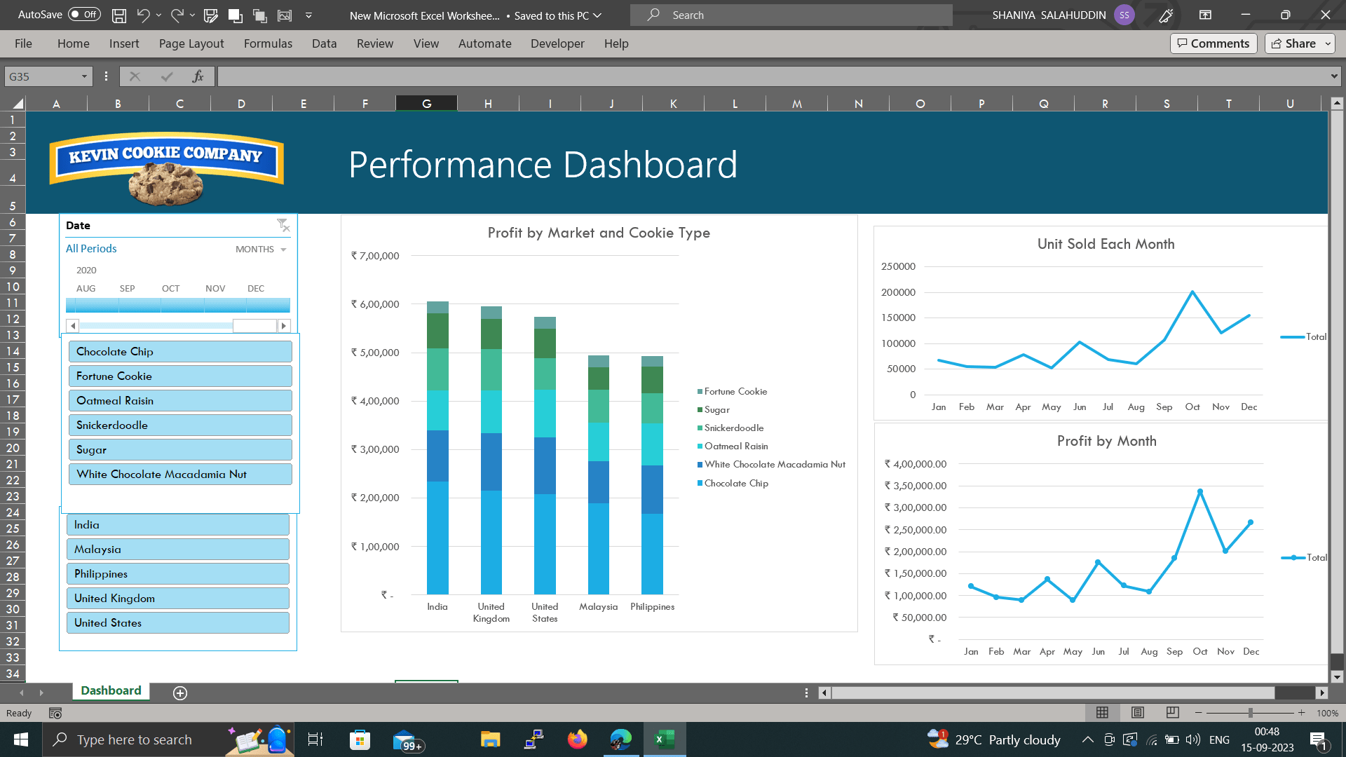 This project involved creating a dashboard in Excel using pivot tables to track the performance of Kevin Cookie Company's products in different markets. The data included the country name, product category, and profit for each month. The dashboard was designed to provide insights into the following key performance indicators (KPIs):